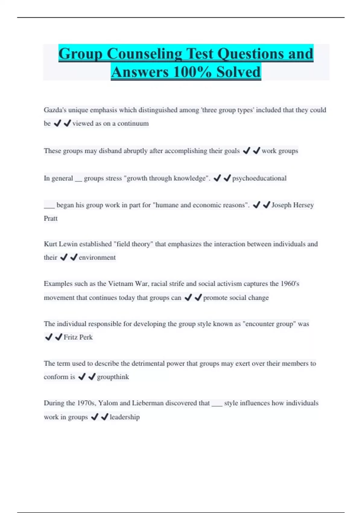 Group Counseling Test Questions and Answers 100% Solved Gazda's unique emphasis which distinguished among 'three group types' included that they could be ️️viewed as on a continuum These groups may disband abruptly after accomplishing their goals ️️work groups In general __ groups stress "growth through knowledge". ️️psychoeducational ___ began his group work in part for "humane and economic reasons". ️️Joseph Hersey Pratt Kurt Lewin established "field theory" that emphasizes the interaction between individuals and their ️️environment Examples such as the Vietnam War, racial strife and social activism captures the 1960's movement that continues today that groups can ️️promote social change The individual responsible for developing the group style known as "encounter group" was ️️Fritz Perk