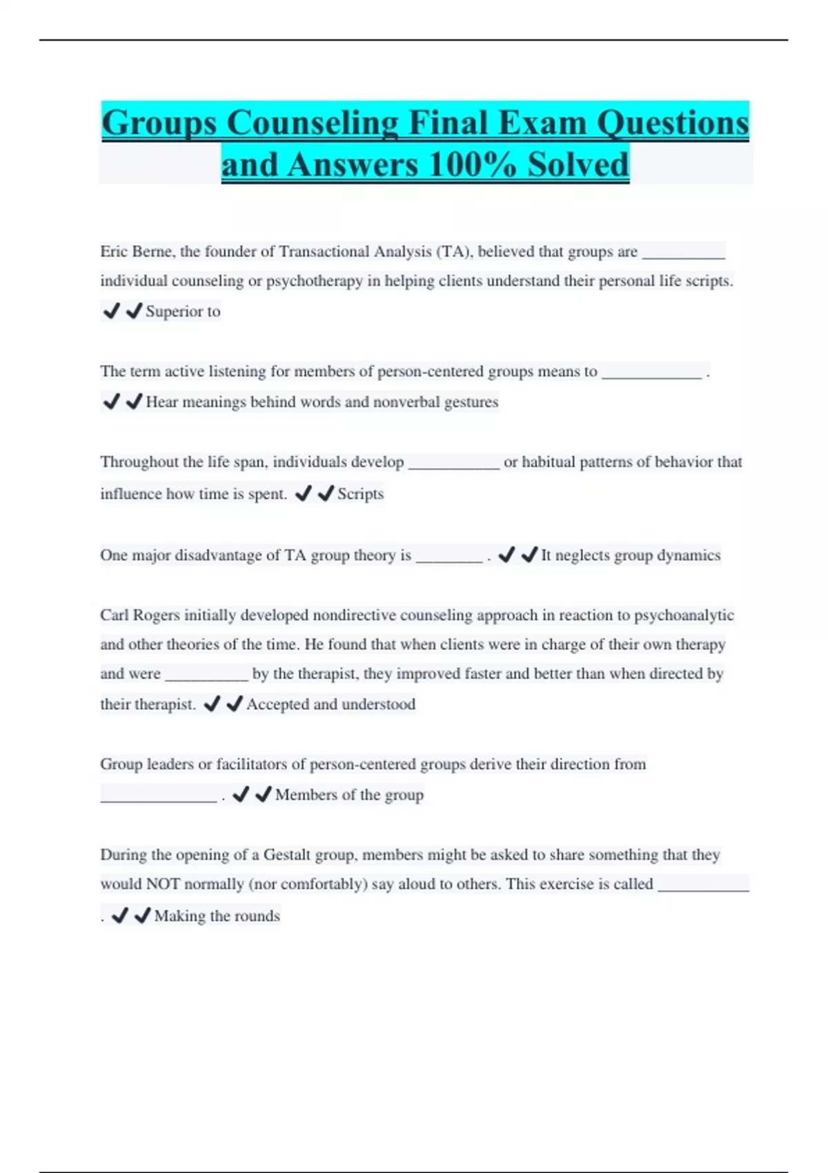 Groups Counseling Final Exam Questions and Answers 100% Solved Eric Berne, the founder of Transactional Analysis (TA), believed that groups are __________ individual counseling or psychotherapy in helping clients understand their personal life scripts. ️️Superior to The term active listening for members of person-centered groups means to ____________ . ️️Hear meanings behind words and nonverbal gestures Throughout the life span, individuals develop ___________ or habitual patterns of behavior that influence how time is spent. ️️Scripts One major disadvantage of TA group theory is ________ . ️️It neglects group dynamics Carl Rogers initially developed nondirective counseling approach in reaction to psychoanalytic and other theories of the time. He found that when clients were in charge of their own therapy and were __________ by the therapist, they improved faster and better than when directed by their therapist. ️️Accepted and understood