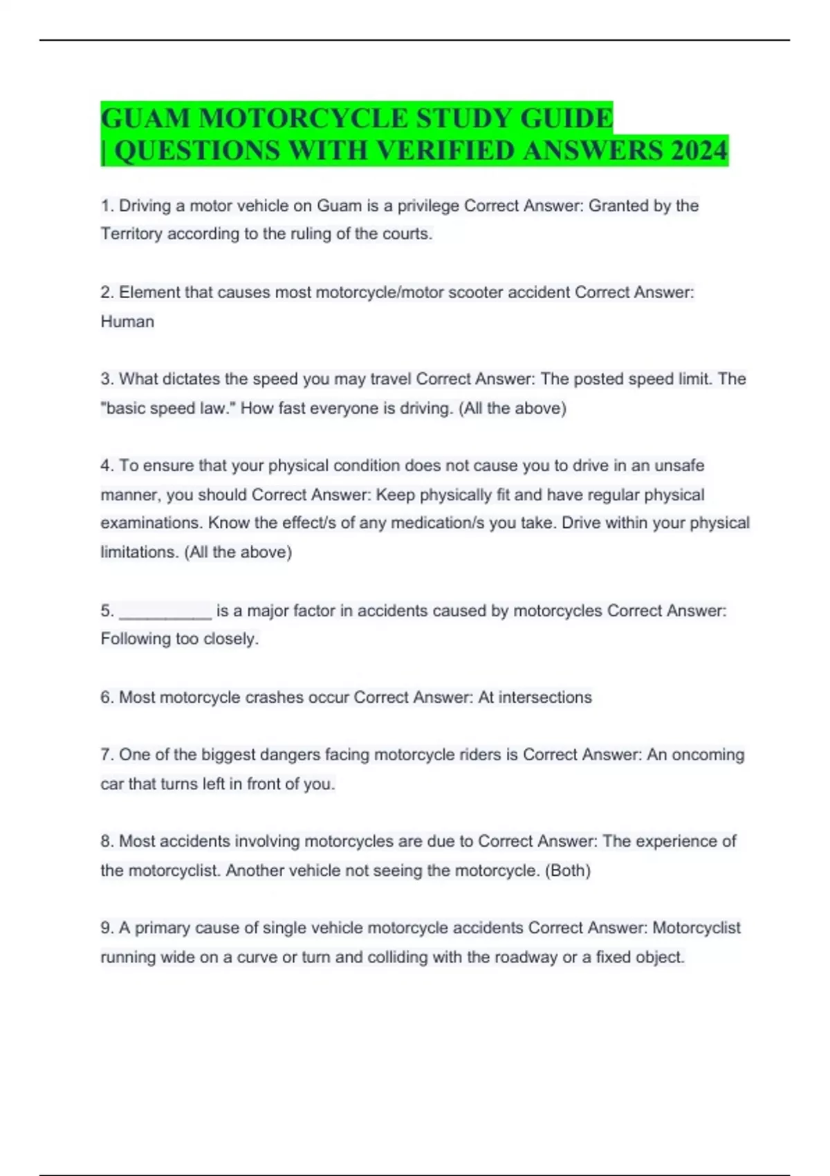 GUAM MOTORCYCLE STUDY GUIDE | QUESTIONS WITH VERIFIED ANSWERS 2024 1. Driving a motor vehicle on Guam is a privilege Correct Answer: Granted by the Territory according to the ruling of the courts. 2. Element that causes most motorcycle/motor scooter accident Correct Answer: Human 3. What dictates the speed you may travel Correct Answer: The posted speed limit. The "basic speed law." How fast everyone is driving. (All the above) 4. To ensure that your physical condition does not cause you to drive in an unsafe manner, you should Correct Answer: Keep physically fit and have regular physical examinations. Know the effect/s of any medication/s you take. Drive within your physical limitations. (All the above) 5. __________ is a major factor in accidents caused by motorcycles Correct Answer: Following too closely. 6. Most motorcycle crashes occur Correct Answer: At intersections 7. One of the biggest dangers facing motorcycle riders is Correct Answer: An oncoming car that turns left in front of you. 8. Most accidents involving motorcycles are due to Correct Answer: The experience of the motorcyclist. Another vehicle not seeing the motorcycle. (Both) 9. A primary cause of single vehicle motorcycle accidents Correct Answer: Motorcyclist running wide on a curve or turn and colliding with the roadway or a fixed object. 10. Motorists often misjudge the approach speed of motorcycles because Correct Answer: Motorcycles are hard to see. 11. When riding at night you should Correct Answer: Reduce your speed because it is harder to see something lying on the road. 12. When driving on bad roads, a motorcycle rider should take appropriate action by Correct Answer: Adjusting riding speed and techniques to the road conditions. (Only the above) 13. If your motorcycle starts to wander back and forth while riding over metal bridge gratings you should Correct Answer: Relax, stay on course, and ride straight across.