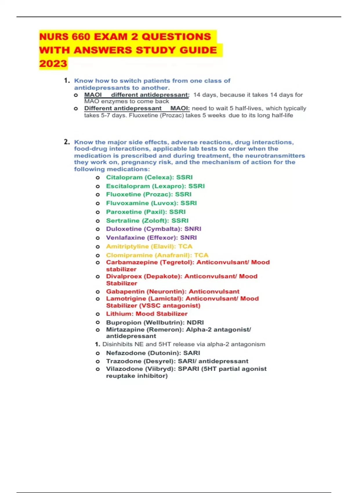 1. Know how to switch patients from one class of antidepressants to another. o MAOI different antidepressant: 14 days, because it takes 14 days for MAO enzymes to come back o Different antidepressant MAOI: need to wait 5 half-lives, which typically takes 5-7 days. Fluoxetine (Prozac) takes 5 weeks due to its long half-life 2. Know the major side effects, adverse reactions, drug interactions, food-drug interactions, applicable lab tests to order when the medication is prescribed and during treatment, the neurotransmitters they work on, pregnancy risk, and the mechanism of action for the following medications: o Citalopram (Celexa): SSRI o Escitalopram (Lexapro): SSRI o Fluoxetine (Prozac): SSRI o Fluvoxamine (Luvox): SSRI o Paroxetine (Paxil): SSRI o Sertraline (Zoloft): SSRI o Duloxetine (Cymbalta): SNRI o Venlafaxine (Effexor): SNRI o Amitriptyline (Elavil): TCA o Clomipramine (Anafranil): TCA o Carbamazepine (Tegretol): Anticonvulsant/ Mood stabilizer o Divalproex (Depakote): Anticonvulsant/ Mood Stabilizer o Gabapentin (Neurontin): Anticonvulsant o Lamotrigine (Lamictal): Anticonvulsant/ Mood Stabilizer (VSSC antagonist) o Lithium: Mood Stabilizer o Bupropion (Wellbutrin): NDRI o Mirtazapine (Remeron): Alpha-2 antagonist/ antidepressant 1. Disinhibits NE and 5HT release via alpha-2 antagonism o Nefazodone (Dutonin): SARI o Trazodone (Desyrel): SARI/ antidepressant o Vilazodone (Viibryd): SPARI (5HT partial agonist reuptake inhibitor) 3. Be able to identify and distinguish between psychiatric emergencies such as serotonin syndrome, hypertensive crisis, Steven Johnson's Syndrome, neuroleptic malignant syndrome and how to manage these emergencies. o Serotonin Syndrome: 1. S/S: fever, tachycardia, HTN, confusion, hyperreflexia, myoclonus 2. Can occur especially if an MOAI is combined with another serotonergic (SSRI, SNRI) 3. Rapid onset, usually seen w/in 24 hours of starting or changing therapy 4. Treatment: Stop the offending med, give benzos, O2 and IV fluids, 5HT blockers o Hypertensive Crisis: 1. Occurs with MAOI and tyramine (caused by increase in DA and NE) 2. S/S: severe chest pain, HA, confusion, blurred vision, N/V, SOB, severe anxiety o Steven Johnson’s Syndrome: 1. S/S: fever and flu-like symptoms, widespread rash and rash around mouth and mucus membranes, fatigue 2. Most worried w/ Lamictal 3. Other meds that cause SJS: Tegretol (to reduce the risk of SJS, test for HLA in pts of Asian descent; Tegretol can also cause toxic epidermal necrolysis) 4. Treatment: immediately stop the offending med, provide supportive treatment o Neuroleptic Malignant Syndrome 4. Know the main differences among SSRIs, SNRIs, MAOIs, and TCAs. o SSRIs 1. Block SERT and inhibit 5HT reuptake 2. General S/E: GI upset (nausea, indigestion, diarrhea), sexual dysfunction, serotonin syndrome, suicidal thoughts, insomnia or hypersomnia 3. **GI upset (indigestion, nausea, diarrhea) are the most common S/E** 4. Do not affect BP o SNRIs 1. Block SERT and NET 2. SNRIs also work on DA, specifically in the prefrontal cortex w/o inhibiting DAT