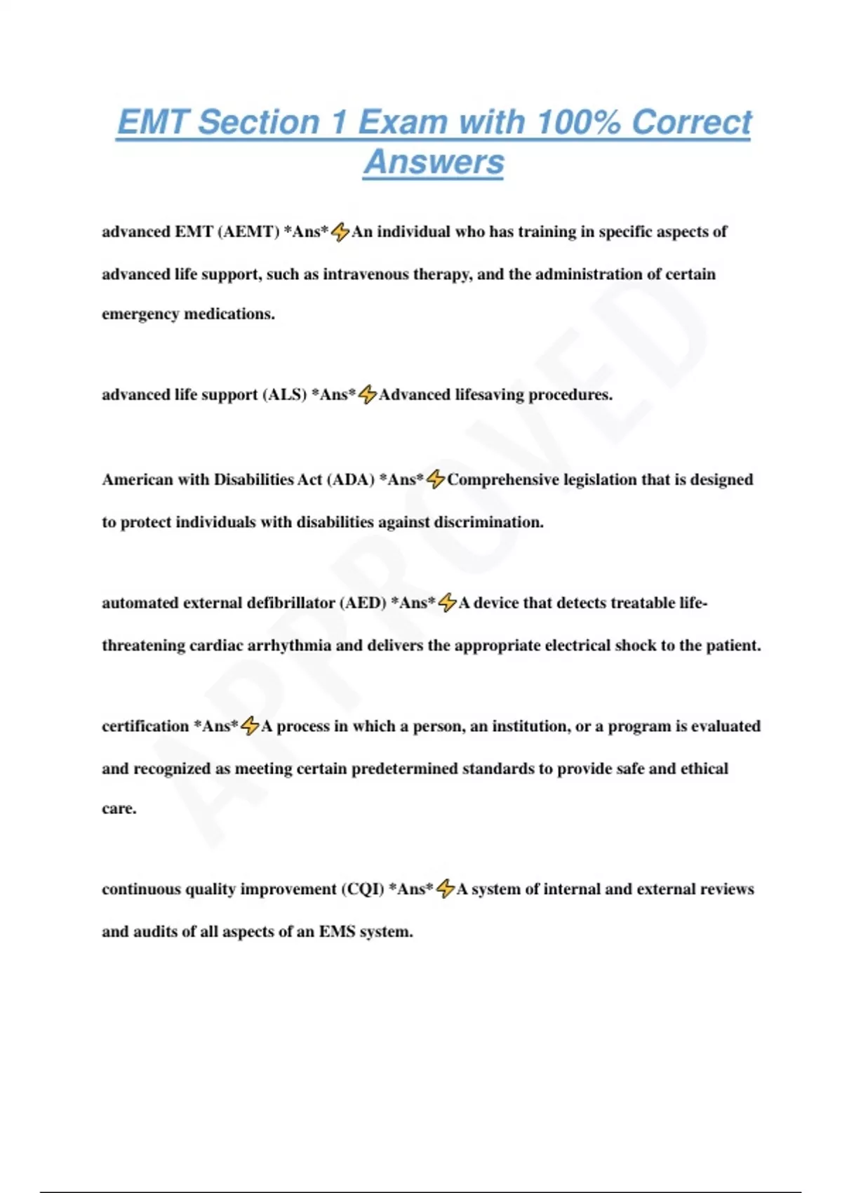 EMT Section 1 Exam with 100% Correct Answers advanced EMT (AEMT) *Ans* An individual who has training in specific aspects of advanced life support, such as intravenous therapy, and the administration of certain emergency medications. advanced life support (ALS) *Ans* Advanced lifesaving procedures. American with Disabilities Act (ADA) *Ans* Comprehensive legislation that is designed to protect individuals with disabilities against discrimination. automated external defibrillator (AED) *Ans* A device that detects treatable lifethreatening cardiac arrhythmia and delivers the appropriate electrical shock to the patient. certification *Ans* A process in which a person, an institution, or a program is evaluated and recognized as meeting certain predetermined standards to provide safe and ethical care. continuous quality improvement (CQI) *Ans* A system of internal and external reviews and audits of all aspects of an EMS system. emergency medical dispatch (EMD) *Ans* A system that assists dispatchers in selecting appropriate units to respond to a particular call for assistance and in providing callers with vital instructions until the arrival of EMS crews. emergency medical responder (EMR) *Ans* The first trained individual, such as a police officer, fire fighter, lifeguard, or other rescuer, to arrive at the scene of an emergency to provide initial medical assistance. emergency medical services (EMS) *Ans* A multidisciplinary system that represents the combined efforts of several professionals and agencies to provide prehosptial emergency care to the sick and injured. emergency medical technician (EMT) *Ans* An individual who has training in basic life support, including automated external defibrillation, use of a definitive airway adjunct, and assisting patients with certain medications. Health Insurance Portability and Accountability Act (HIPAA) *Ans* Federal legislation passed in 1996. Its main effect in EMS is in limiting availability of patients' health care information and penalizing violations of patient privacy. intravenous (IV) therapy *Ans* The delivery of medication directly into a vein. licensure *Ans* The process whereby a state allows individuals to perform a regulated act. medical control *Ans* Physician instructions that are given directly by radio or cell phone (online/direct) or indirectly by protocol/guidelines (off-lines/indirect), as authorized by the medical director of the se