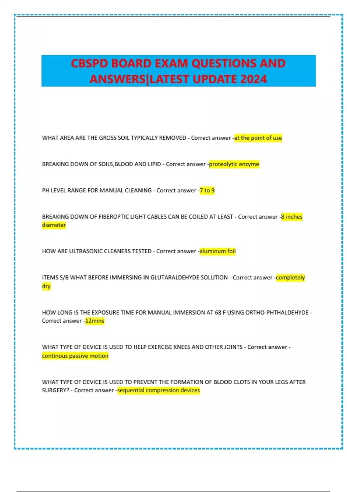 WHAT AREA ARE THE GROSS SOIL TYPICALLY REMOVED - Correct answer -at the point of use BREAKING DOWN OF SOILS,BLOOD AND LIPID - Correct answer -proteolytic enzyme PH LEVEL RANGE FOR MANUAL CLEANING - Correct answer -7 to 9 BREAKING DOWN OF FIBEROPTIC LIGHT CABLES CAN BE COILED AT LEAST - Correct answer -8 inches diameter HOW ARE ULTRASONIC CLEANERS TESTED - Correct answer -aluminum foil ITEMS S/B WHAT BEFORE IMMERSING IN GLUTARALDEHYDE SOLUTION - Correct answer -completely dry HOW LONG IS THE EXPOSURE TIME FOR MANUAL IMMERSION AT 68 F USING ORTHO-PHTHALDEHYDE - Correct answer -12mins