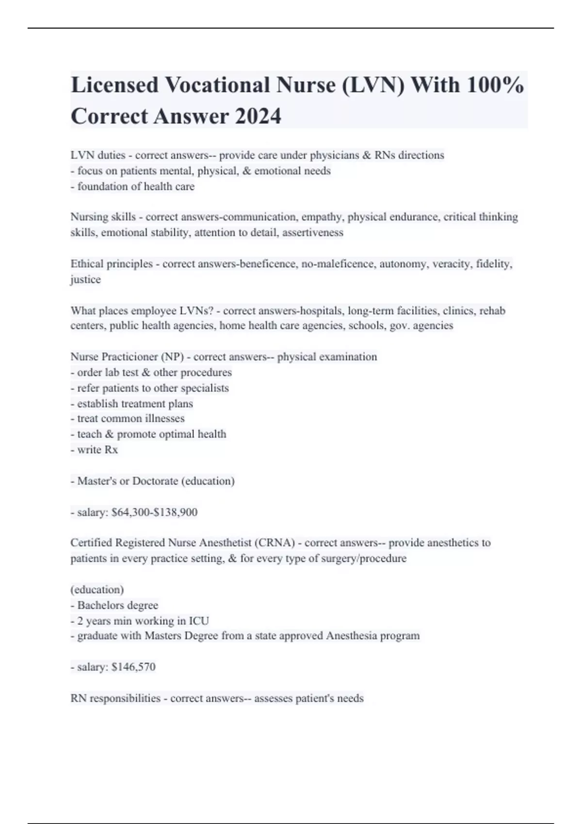 Licensed Vocational Nurse (LVN) With 100% Correct Answer 2024