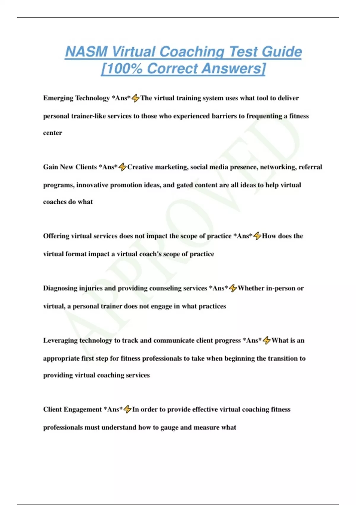 NASM Virtual Coaching Test Guide [100% Correct Answers] Emerging Technology *Ans* The virtual training system uses what tool to deliver personal trainer-like services to those who experienced barriers to frequenting a fitness center Gain New Clients *Ans* Creative marketing, social media presence, networking, referral programs, innovative promotion ideas, and gated content are all ideas to help virtual coaches do what Offering virtual services does not impact the scope of practice *Ans* How does the virtual format impact a virtual coach's scope of practice Diagnosing injuries and providing counseling services *Ans* Whether in-person or virtual, a personal trainer does not engage in what practices Leveraging technology to track and communicate client progress *Ans* What is an appropriate first step for fitness professionals to take when beginning the transition to providing virtual coaching services Client Engagement *Ans* In order to provide effective virtual coaching fitness professionals must understand how to gauge and measure what Meal planning and nutrition therapy *Ans* Whether providing services in-person or virtually, a certified nutrition coach does not engage in what Set consistent working hours *Ans* How can virtual coaches be proactive about maintaining work-life balance Virtual Check-Ins *Ans* Which virtual service adds accountability, consistency, and a sense of support to the client-coach relationship Hybrid Training *Ans* Which current trend in virtual coaching integrates virtual strategies with in-person training methods Address, emergency contact, and local police department phone number *Ans* What information should virtual coaches obtain from clients in case of an emergency Non-Traditional hours for coaching *Ans* Working with shift workers or those with demanding work schedules may require the virtual coach to provide which accommodation Pre-designed workouts *Ans* Which service is often used to complement the virtual coaching experience Communication *Ans* Which is a common initial challenge for fitness professionals transitioning or augmenting current services w