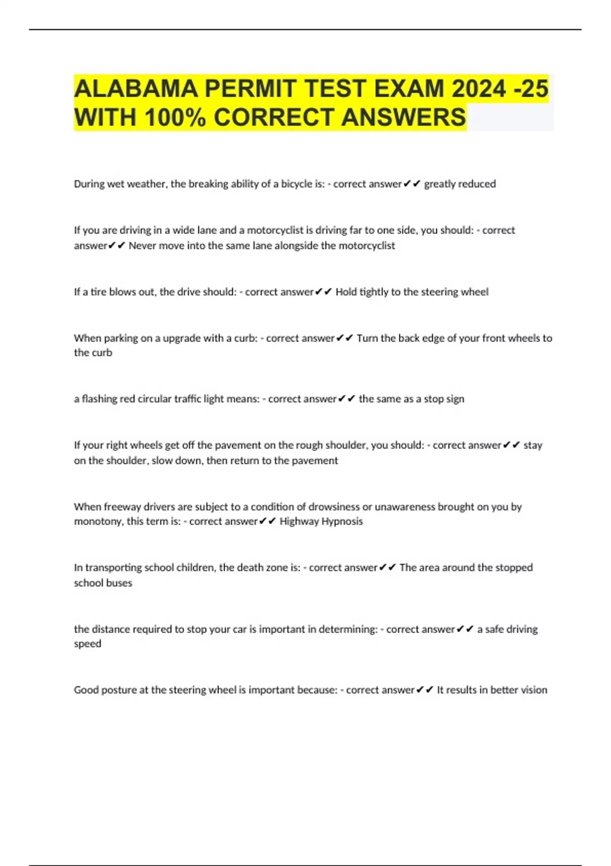 ALABAMA PERMIT TEST EXAM 2024 -25 WITH 100% CORRECT ANSWERS During wet weather, the breaking ability of a bicycle is: - correct answer greatly reduced If you are driving in a wide lane and a motorcyclist is driving far to one side, you should: - correct answer Never move into the same lane alongside the motorcyclist If a tire blows out, the drive should: - correct answer Hold tightly to the steering wheel When parking on a upgrade with a curb: - correct answer Turn the back edge of your front wheels to the curb a flashing red circular traffic light means: - correct answer the same as a stop sign If your right wheels get off the pavement on the rough shoulder, you should: - correct answer stay on the shoulder, slow down, then return to the pavement When freeway drivers are subject to a condition of drowsiness or unawareness brought on you by monotony, this term is: - correct answer Highway Hypnosis