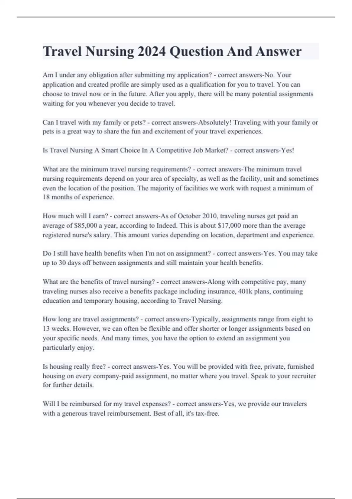 Travel Nursing 2024 Question And Answer