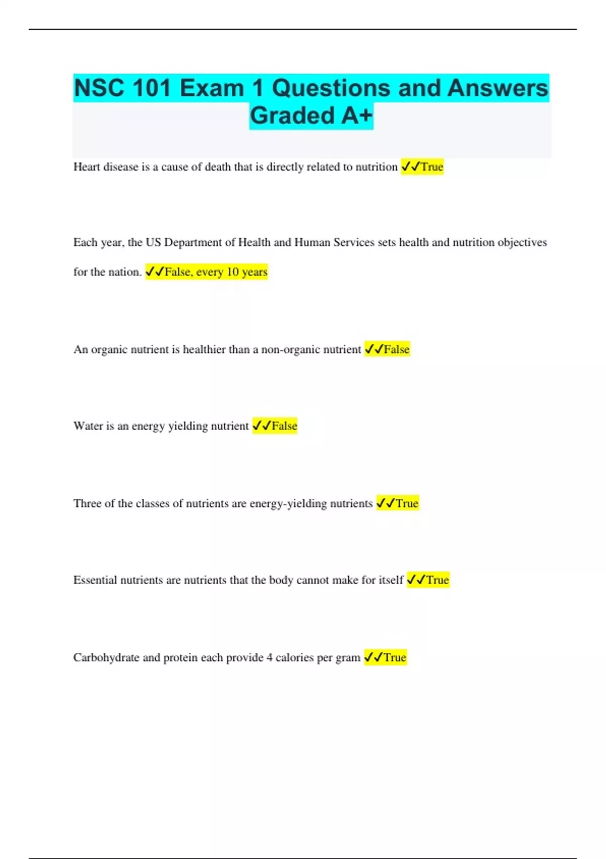 NSC 101 Exam 1 Questions and Answers Graded A+ Heart disease is a cause of death that is directly related to nutrition True Each year, the US Department of Health and Human Services sets health and nutrition objectives for the nation. False, every 10 years An organic nutrient is healthier than a non-organic nutrient False Water is an energy yielding nutrient False Three of the classes of nutrients are energy-yielding nutrients True Essential nutrients are nutrients that the body cannot make for itself True Carbohydrate and protein each provide 4 calories per gram True Calorie control is the characteristic of a nutritious diet that ensures energy intake from food is balanced with energy expenditure. True One well controlled experiment can "prove" or "disprove" a nutrition claim. False You can tell a claim about nutrition is suspect if: it is being made by an advertiser who is paid to make claims Which research design is among the most powerful tools in nutrition research because it shows the effects of treatments? intervention study What is an essential nutrient? a nutrient that must be consumed in the diet For a food to be a "good source" of a nutrient, it must contain between 5 and 10% of the Daily Value for that nutrient per serving. False, 10-19% Using the USDA Food Intake Patterns plan, soybeans and other legumes are considered part of the vegetable food group for non-vegetarians. True Structure-function claims must be approved by the FDA before being printed on a product label. False For vegetables and protein foods, intakes should be divided among all the subgroups every day. False, every week Which of the following people would NOT be covered by the DRI values? a. Tim, a 20-year-old vegetarian b. Karen, a 36-year-old pregnant woman c. Joe, a 50 year old who has inflammatory bowel disease d. Ann, a 5 year old who refuses to eat vegetables e. Kelly, a 30-year-old woman who is an avid athlete Joe, a 50 year old who has inflammatory bowel disease For a food to be labeled "low fat," it must contain