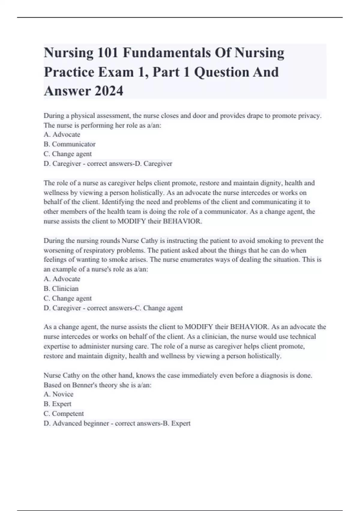 Nursing 101 Fundamentals Of Nursing Practice Exam 1, Part 1 Question And Answer 2024