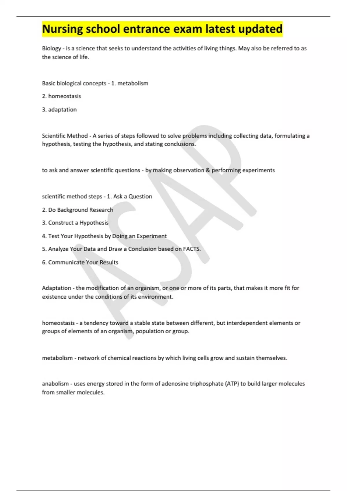 Nursing school entrance exam latest updated Biology - is a science that seeks to understand the activities of living things. May also be referred to as the science of life. Basic biological concepts - 1. metabolism 2. homeostasis 3. adaptation Scientific Method - A series of steps followed to solve prob