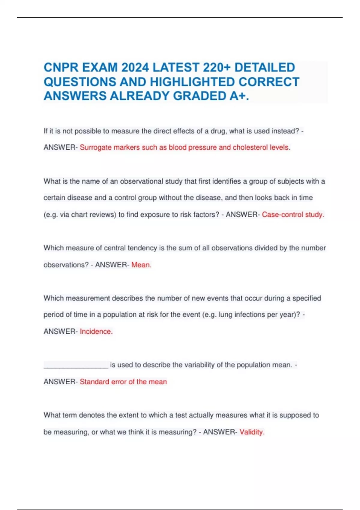 CNPR EXAM 2024 LATEST 220+ DETAILED QUESTIONS AND ANSWERS AND HIGHLIGTED CORRECT ANSWERS ALREADY GRADED A+ If it is not possible to measure the direct effects of a drug .What is used instead? ANSWER -Surrogate markers such as blood pressure and cholesterol levels.
