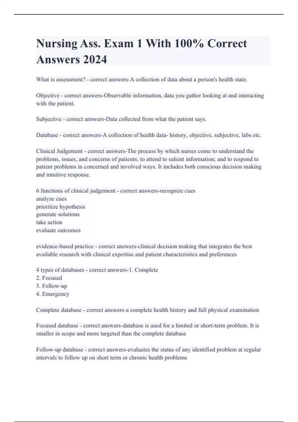 Complete database - correct answers-a complete health history and full physical examination