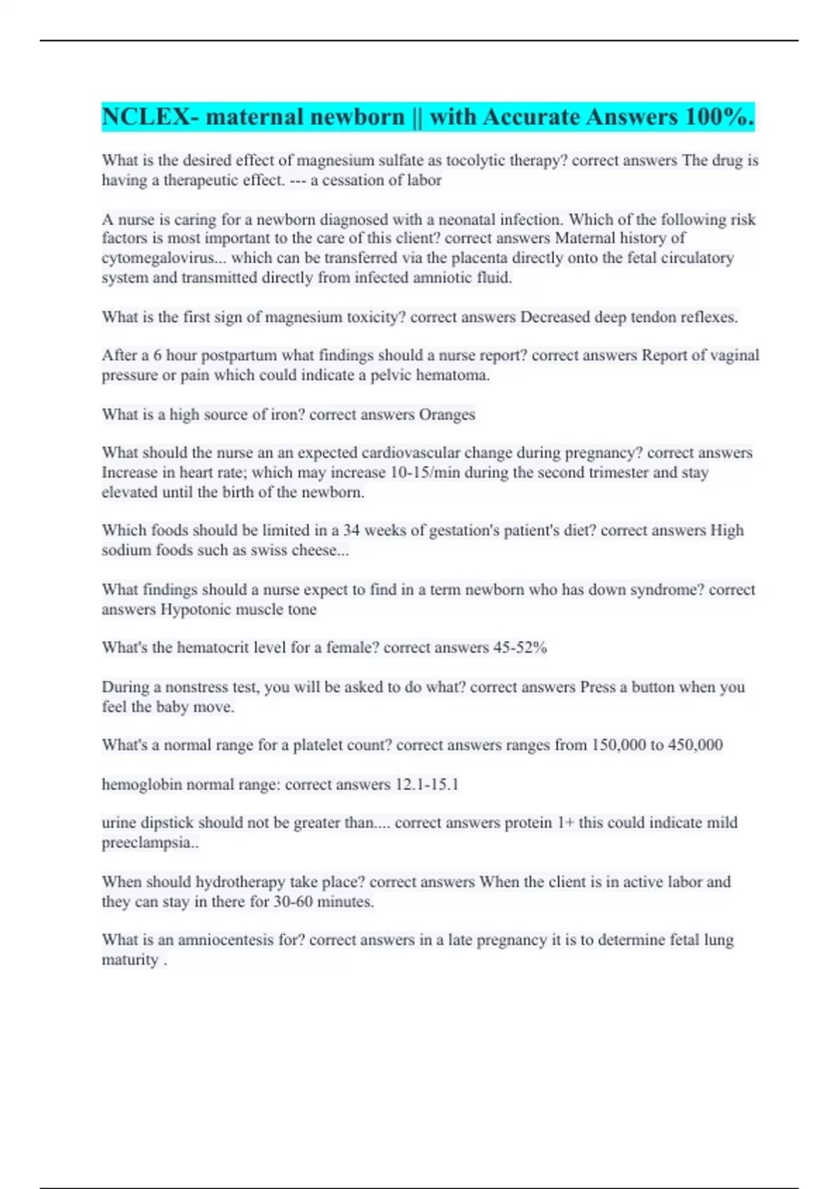 What is the desired effect of magnesium sulfate as tocolytic therapy? correct answers The drug is having a therapeutic effect. --- a cessation of labor A nurse is caring for a newborn diagnosed with a neonatal infection. Which of the following risk factors is most important to the care of this client? correct answers Maternal history of cytomegalovirus... which can be transferred via the placenta directly onto the fetal circulatory system and transmitted directly from infected amniotic fluid. What is the first sign of magnesium toxicity? correct answers Decreased deep tendon reflexes. After a 6 hour postpartum what findings should a nurse report? correct answers Report of vaginal pressure or pain which could indicate a pelvic hematoma. What is a high source of iron? correct answers Oranges What should the nurse an an expected cardiovascular change during pregnancy? correct answers Increase in heart rate; which may increase 10-15/min during the second trimester and stay elevated until the birth of the newborn. Which foods should be limited in a 34 weeks of gestation's patient's diet? correct answers High sodium foods such as swiss cheese... What findings should a nurse expect to find in a term newborn who has down syndrome? correct answers Hypotonic muscle tone What's the hematocrit level for a female? correct answers 45-52% During a nonstress test, you will be asked to do what? correct answers Press a button when you feel the baby move. What's a normal range for a platelet count? correct answers ranges from 150,000 to 450,000 hemoglobin normal range: correct answers 12.1-15.1 urine dipstick should not be greater than.... correct answers protein 1+ this could indicate mild preeclampsia.. When should hydrotherapy take place? correct answers When the client is in active labor and they can stay in there for 30-60 minutes. What is an amniocentesis for? correct answers in a late pregnancy it is to determine fetal lung maturity .