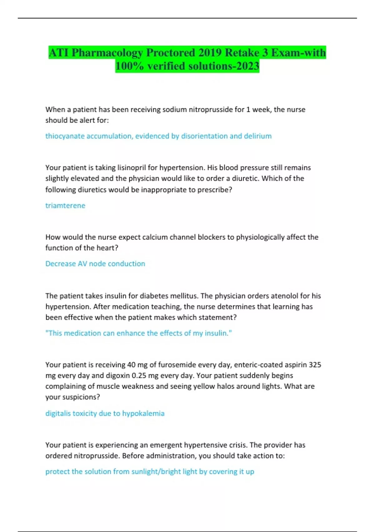 ATI Pharmacology Proctored 2019 Retake 3 Exam-with 100% verified solutions-2023