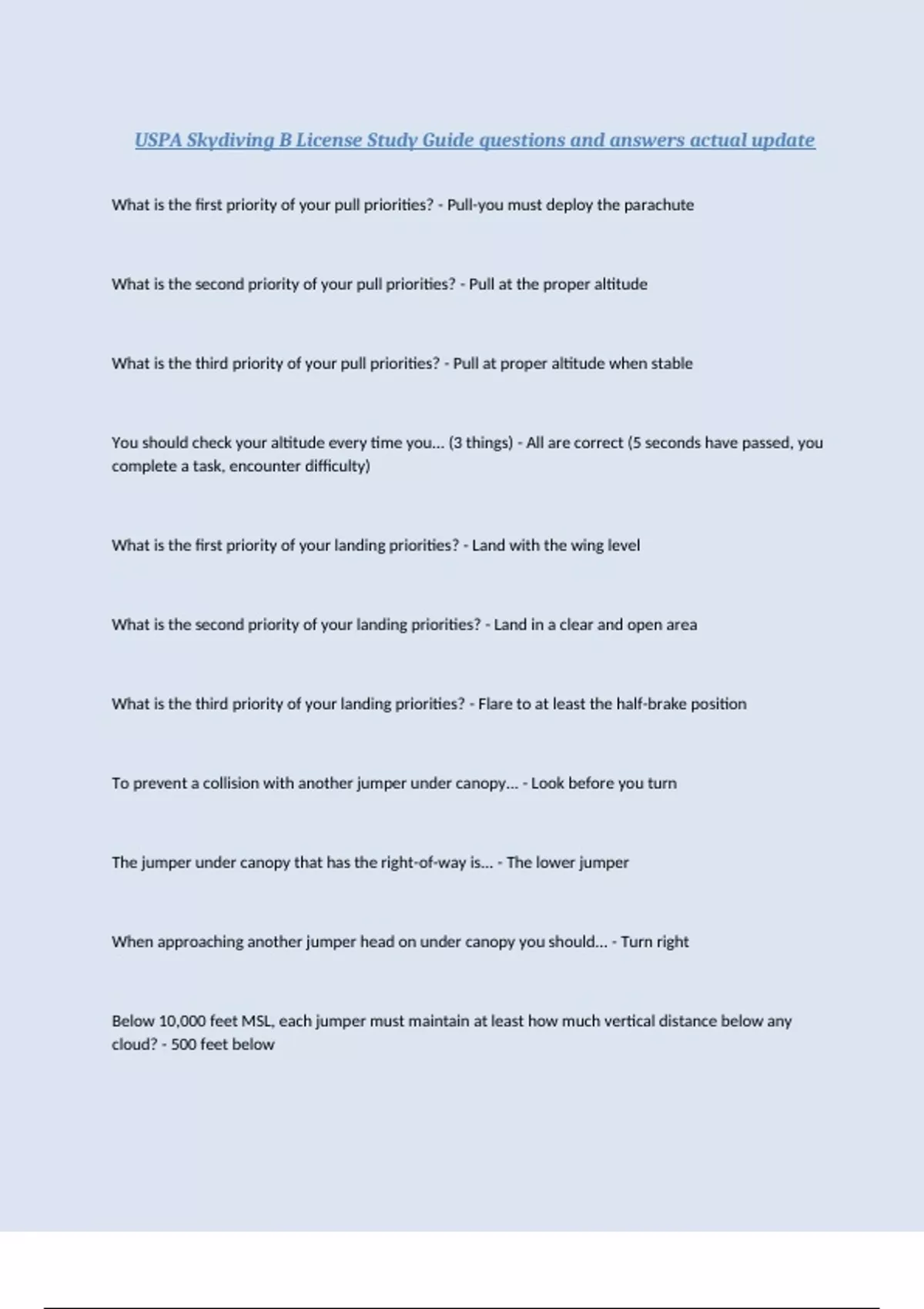 USPA Skydiving B License Study Guide questions and answers actual update.