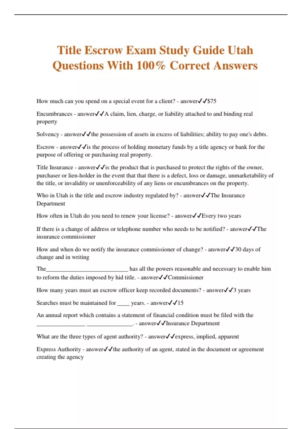 Title Escrow Exam Study Guide Utah Questions With 100% Correct Answers How much can you spend on a special event for a client? - answer$75 Encumbrances - answerA claim, lien, charge, or liability attached to and binding real property Solvency - answerthe possession of assets in excess of liabilities; ability to pay one's debts. Escrow - answeris the process of holding monetary funds by a title agency or bank for the purpose of offering or purchasing real property. Title Insurance - answeris the product that is purchased to protect the rights of the owner, purchaser or lien-holder in the event that that there is a defect, loss or damage, unmarketability of the title, or invalidity or unenforceability of any liens or encumbrances on the property. Who in Utah is the title and escrow industry regulated by? - answerThe Insurance Department How often in Utah do you need to renew your license? - answerEvery two years If there is a change of address or telephone number who needs to be notified? - answerThe insurance commissioner How and when do we notify the insurance commissioner of change? - answer30 days of change and in writing The___________________________ has all the powers reasonable and necessary to enable him to reform the duties imposed by hid title. - answerCommissioner How many years must an escrow officer keep recorded documents? - answer3 years Searches must be maintained for ____ years. - answer15 An annual report which contains a statement of financial condition must be filed with the ________________ _______________. - answerInsurance Department What are the three types of agent authority? - answerexpress, implied, apparent Express Authority - answerthe authority of an agent, stated in the document or agreement creating the agency