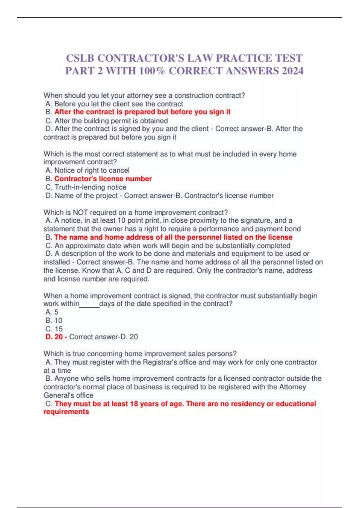 CSLB CONTRACTOR'S LAW PRACTICE TEST PART 2 WITH 100% CORRECT ANSWERS 2024