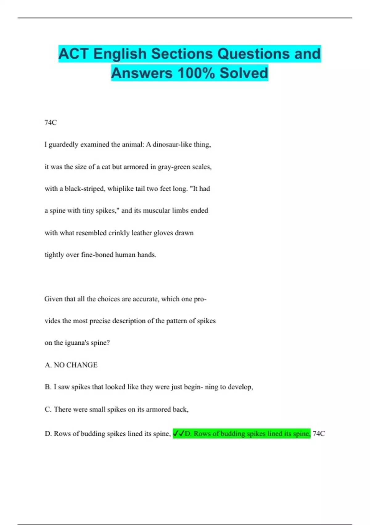 ACT English Sections Questions and Answers 100% Solved 74C I guardedly examined the animal: A dinosaur-like thing, it was the size of a cat but armored in gray-green scales, with a black-striped, whiplike tail two feet long. "It had a spine with tiny spikes," and its muscular limbs ended with what resembled crinkly leather gloves drawn tightly over fine-boned human hands. Given that all the choices are accurate, which one provides the most precise description of the pattern of spikes on the iguana's spine? A. NO CHANGE B. I saw spikes that looked like they were just begin- ning to develop, C. There were small spikes on its armored back, D. Rows of budding spikes lined its spine, D. Rows of budding spikes lined its spine, 74C