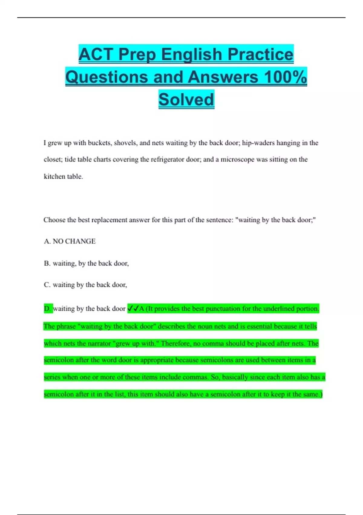ACT Prep English Practice Questions and Answers 100% Solved I grew up with buckets, shovels, and nets waiting by the back door; hip-waders hanging in the closet; tide table charts covering the refrigerator door; and a microscope was sitting on the kitchen table. Choose the best replacement answer for this part of the sentence: "waiting by the back door;" A. NO CHANGE B. waiting, by the back door, C. waiting by the back door, D. waiting by the back door A (It provides the best punctuation for the underlined portion. The phrase "waiting by the back door" describes the noun nets and is essential because it tells which nets the narrator "grew up with." Therefore, no comma should be placed after nets. The semicolon after the word door is appropriate because semicolons are used between items in a series when one or more of these items include commas. So, basically since each item also has a semicolon after it in the list, this item should also have a semicolon after it to keep it the same.)