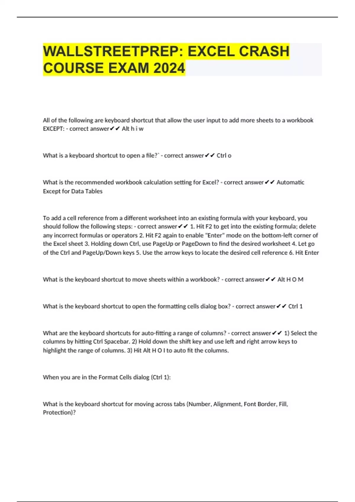 WALLSTREETPREP: EXCEL CRASH COURSE EXAM 2024 All of the following are keyboard shortcut that allow the user input to add more sheets to a workbook EXCEPT: - correct answer Alt h i w What is a keyboard shortcut to open a file?` - correct answer Ctrl o What is the recommended workbook calculation setting for Excel? - correct answer Automatic Except for Data Tables To add a cell reference from a different worksheet into an existing formula with your keyboard, you should follow the following steps: - correct answer 1. Hit F2 to get into the existing formula; delete any incorrect formulas or operators 2. Hit F2 again to enable "Enter" mode on the bottom-left corner of the Excel sheet 3. Holding down Ctrl, use PageUp or PageDown to find the desired worksheet 4. Let go of the Ctrl and PageUp/Down keys 5. Use the arrow keys to locate the desired cell reference 6. Hit Enter What is the keyboard shortcut to move sheets within a workbook? - correct answer Alt H O M What is the keyboard shortcut to open the formatting cells dialog box? - correct answer Ctrl 1 What are the keyboard shortcuts for auto-fitting a range of columns? - correct answer 1) Select the columns by hitting Ctrl Spacebar. 2) Hold down the shift key and use left and right arrow keys to highlig