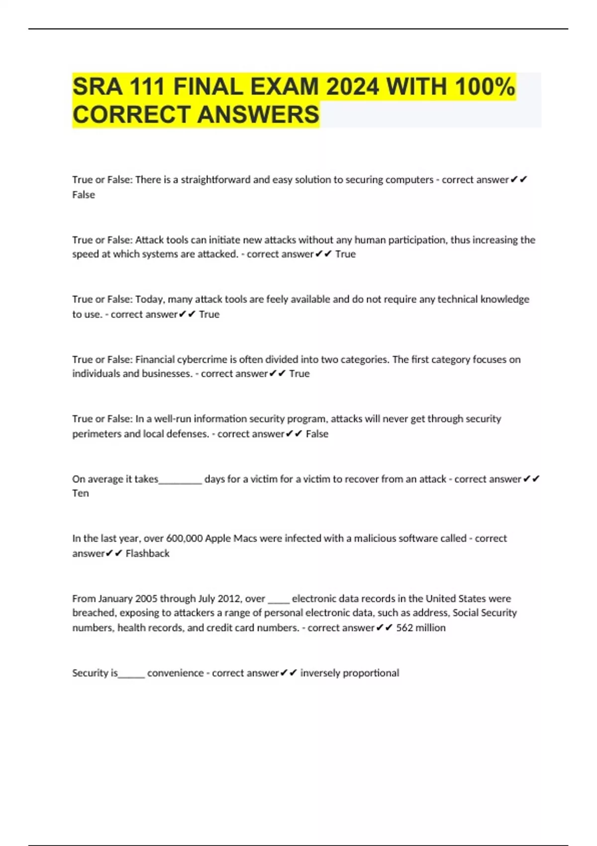 SRA 111 FINAL EXAM 2024 WITH 100% CORRECT ANSWERS True or False: There is a straightforward and easy solution to securing computers - correct answer False True or False: Attack tools can initiate new attacks without any human participation, thus increasing the speed at which systems are attacked. - correct answer True True or False: Today, many attack tools are feely available and do not require any technical knowledge to use. - correct answer True True or False: Financial cybercrime is often divided into two categories. The first category focuses on individuals and businesses. - correct answer True True or False: In a well-run information security program, attacks will never get through security perimeters and local defenses. - correct answer False On average it takes________ days for a victim for a victim to recover from an attack - correct answer Ten In th