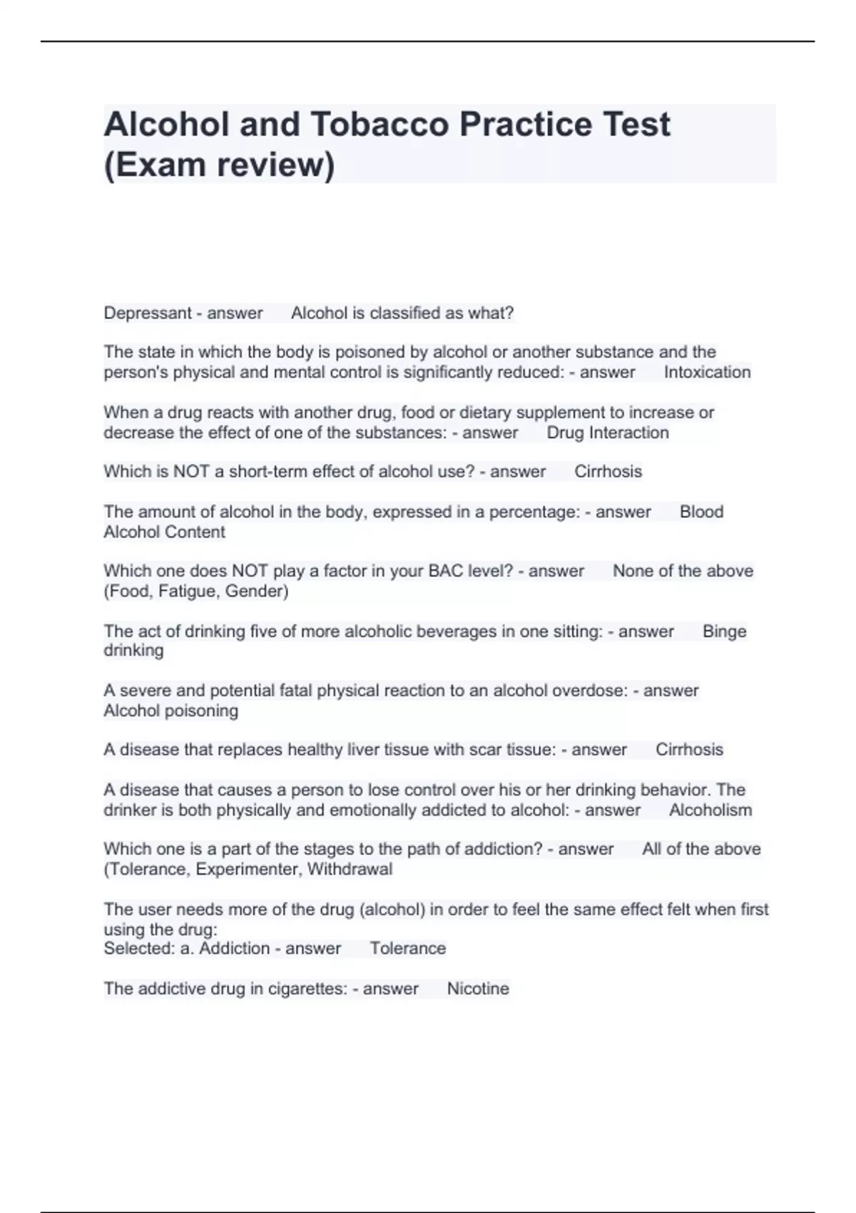 Alcohol and Tobacco Practice Test (Exam review)