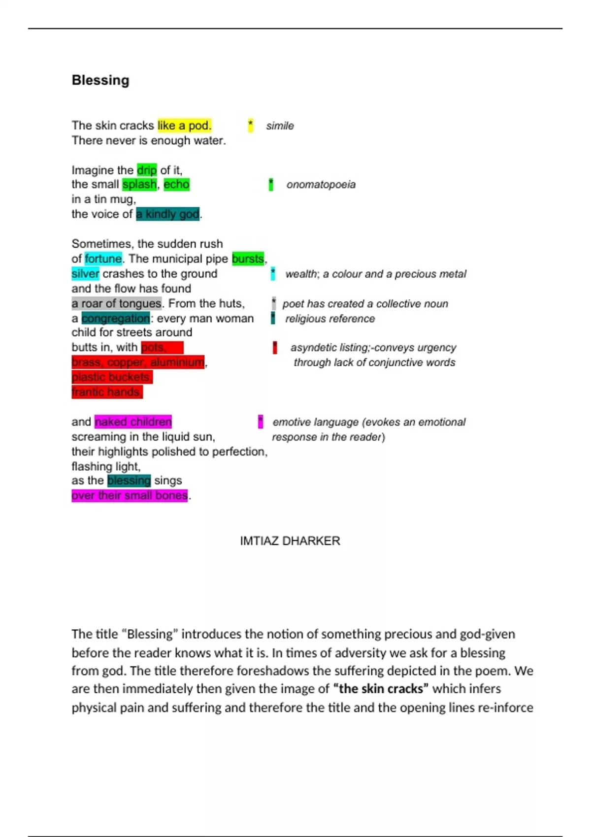 GCSE ENGLISH LITERATURE level 9 analysis of "Blessing" by IMTIAZ DHARKER