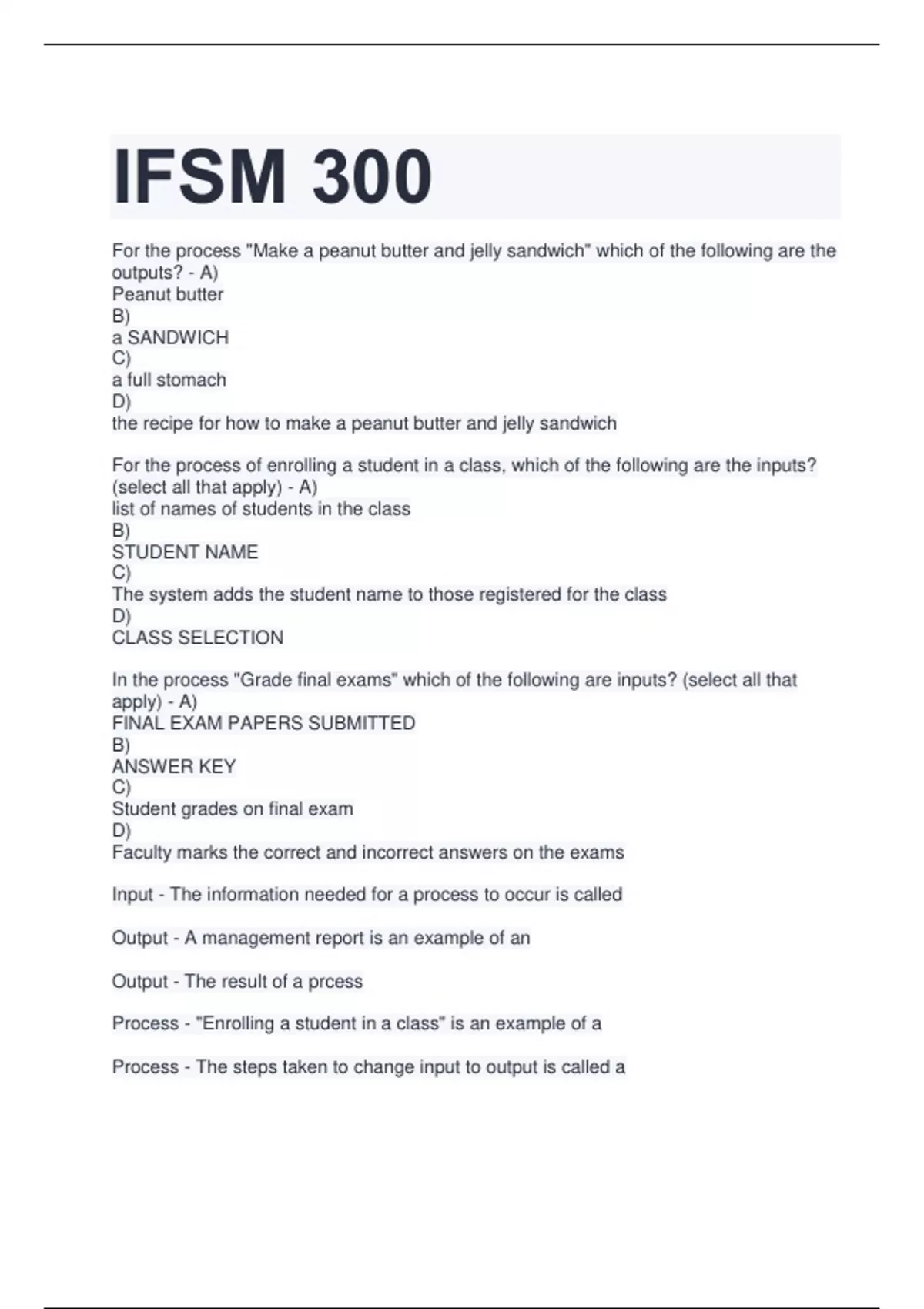 For the process "Make a peanut butter and jelly sandwich" which of the following are the outputs? - A) Peanut butter B) a SANDWICH C) a full stomach D) the recipe for how to make a peanut butter and jelly sandwich For the process of enrolling a student in a class, which of the following are the inputs? (select all that apply) - A) list of names of students in the class B) STUDENT NAME C) The system adds the student name to those registered for the class D) CLASS SELECTION In the process "Grade final exams" which of the following are inputs? (select all that apply) - A) FINAL EXAM PAPERS SUBMITTED B) ANSWER KEY C) Student grades on final exam D) Faculty marks the correct and incorrect answers on the exams Input - The information needed for a process to occur is called Output - A management report is an example of an Output - The result of a prcess Process - "Enrolling a student in a class" is an example of a Process - The steps taken to change input to output is called a