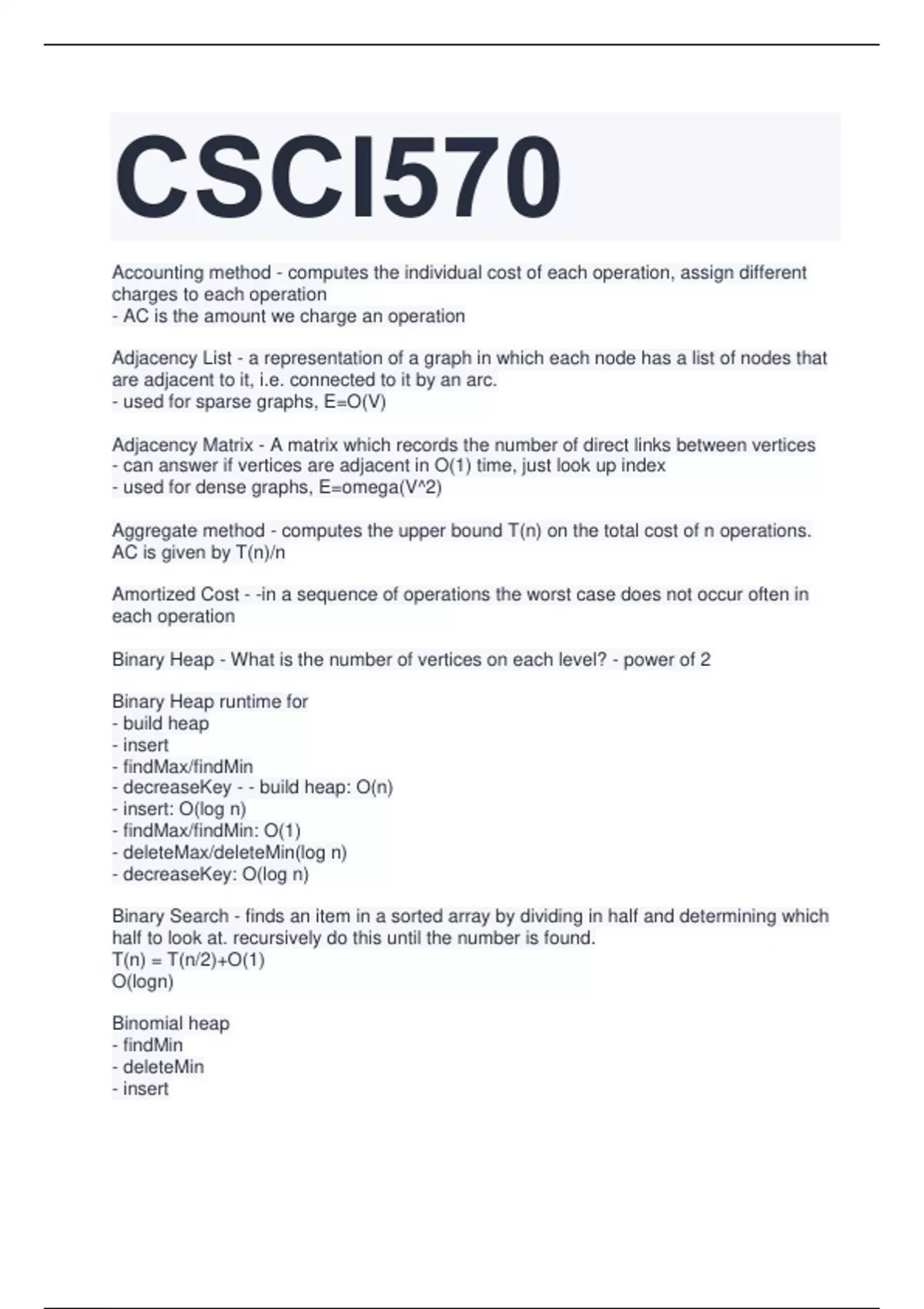 Accounting method - computes the individual cost of each operation, assign different charges to each operation - AC is the amount we charge an operation Adjacency List - a representation of a graph in which each node has a list of nodes that are adjacent to it, i.e. connected to it by an arc. - used for sparse graphs, E=O(V) Adjacency Matrix - A matrix which records the number of direct links between vertices - can answer if vertices are adjacent in O(1) time, just look up index - used for dense graphs, E=omega(V^2) Aggregate method - computes the upper bound T(n) on the total cost of n operations. AC is given by T(n)/n Amortized Cost - -in a sequence of operations the worst case does not occur often in each operation Binary Heap - What is the number of vertices on each level? - power of 2 Binary Heap runtime for - build heap - insert - findMax/findMin - decreaseKey - - build heap: O(n) - insert: O(log n) - findMax/findMin: O(1) - deleteMax/deleteMin(log n) - decreaseKey: O(log n) Binary Search - finds an item in a sorted array by dividing in half and determining which half to look at. recursively do this until the number is found. T(n) = T(n/2)+O(1) O(logn) Binomial heap - findMin - deleteMin - insert - decreaseKey - merge - - findMin: O(1) - deleteMin: O(log n) - insert: O(1) ac - decreaseKey: O(log n) - merge: O(log n)