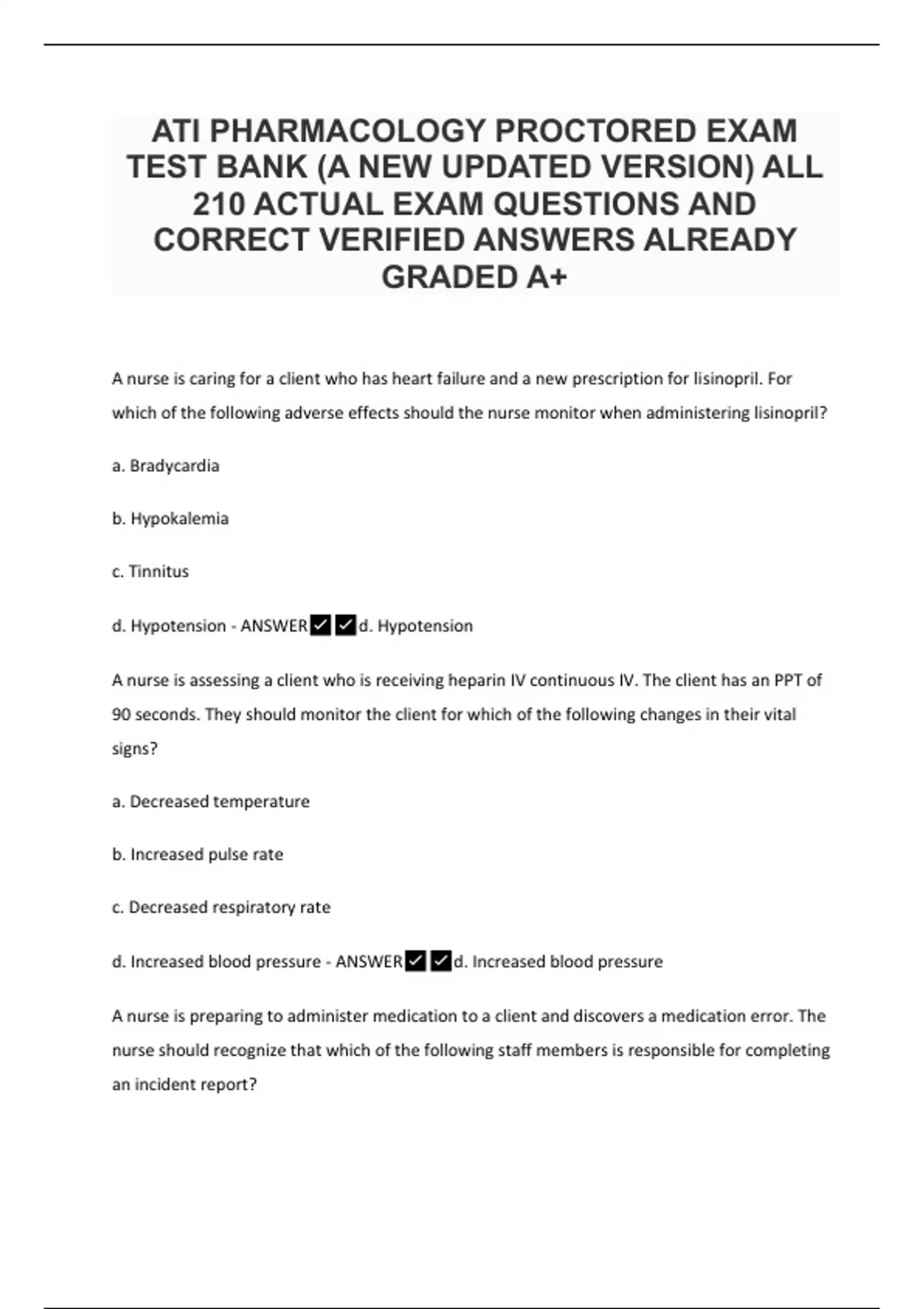 ATI PHARMACOLOGY PROCTORED EXAM TEST BANK (A NEW UPDATED VERSION) ALL 210 ACTUAL EXAM QUESTIONS AND CORRECT VERIFIED ANSWERS ALREADY GRADED A+