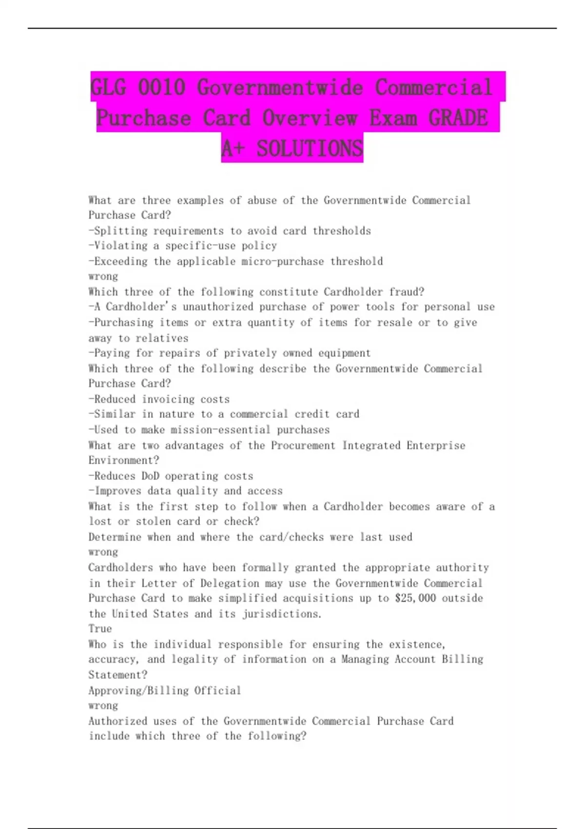 Purchase Card Overview Exam GRADE