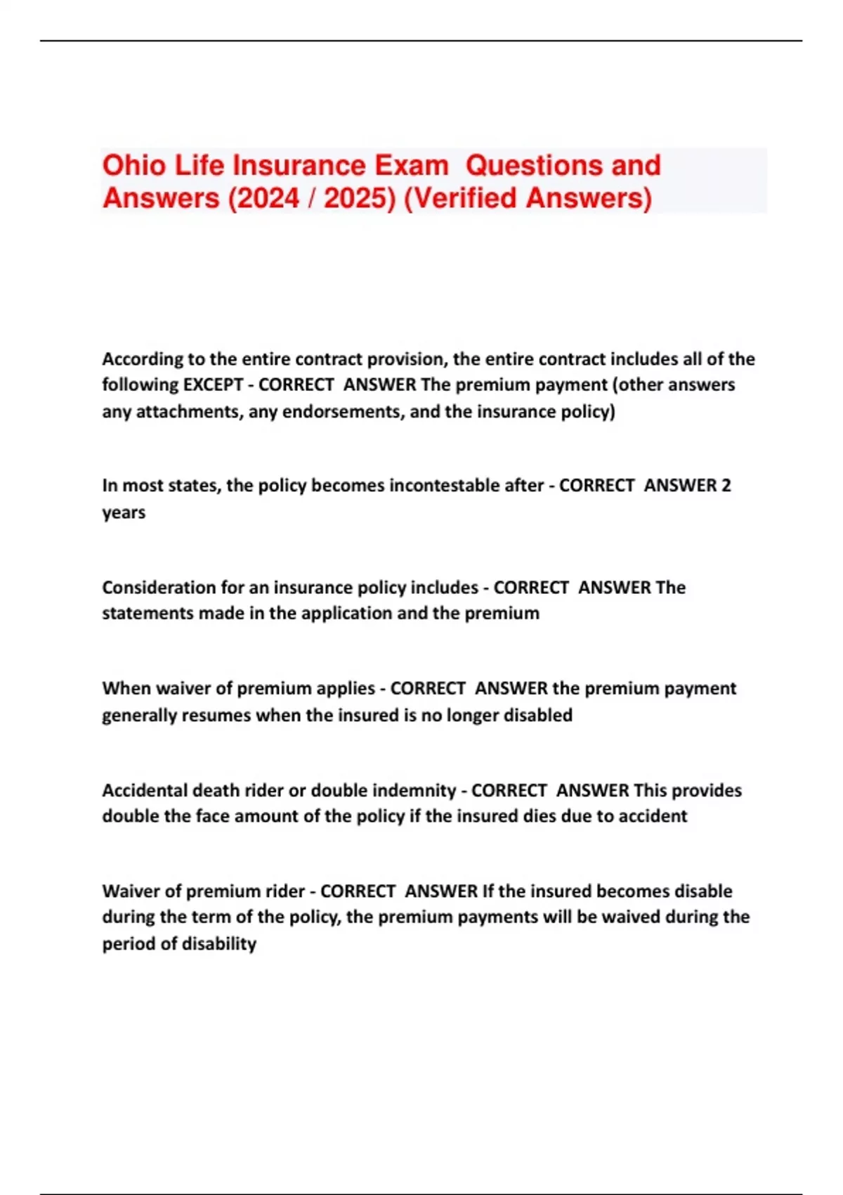 Ohio Life Insurance Exam Questions and Answers (2024 / 2025) (Verified Answers) According to the entire contract provision, the entire contract includes all of the following EXCEPT - CORRECT ANSWER The premium payment (other answers any attachments, any endorsements, and the insurance policy) In most states, the policy becomes incontestable after - CORRECT ANSWER 2 years Consideration for an insurance policy includes - CORRECT ANSWER The statements made in the application and the premium When waiver of premium applies - CORRECT ANSWER the premium payment generally resumes when the insured is no longe