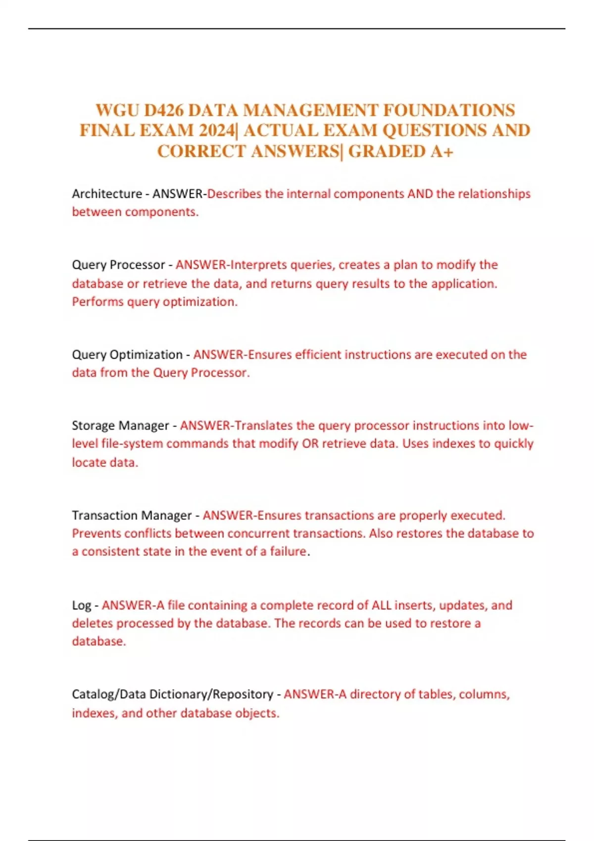 WGU D426 DATA MANAGEMENT FOUNDATIONS FINAL EXAM 2024| ACTUAL EXAM QUESTIONS AND CORRECT ANSWERS| GRADED A+ Architecture - ANSWER-Describes the internal components AND the relationships between components. Query Processor - ANSWER-Interprets queries, creates a plan to modify the database or retrieve the data, and returns query results to the application. Performs query optimization.