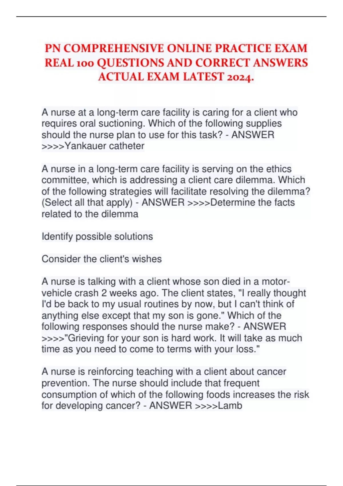 PN COMPREHENSIVE ONLINE PRACTICE EXAM REAL 100 QUESTIONS AND CORRECT ANSWERS ACTUAL EXAM LATEST 2024. PN COMPREHENSIVE ONLINE PRACTICE EXAM REAL 100 QUESTIONS AND CORRECT ANSWERS ACTUAL EXAM LATEST 2024.PN COMPREHENSIVE ONLINE PRACTICE EXAM REAL 100 QUESTIONS AND CORRECT ANSWERS ACTUAL EXAM LATEST 2024.PN COMPREHENSIVE ONLINE PRACTICE EXAM REAL 100 QUESTIONS AND CORRECT ANSWERS ACTUAL EXAM LATEST 2024.
