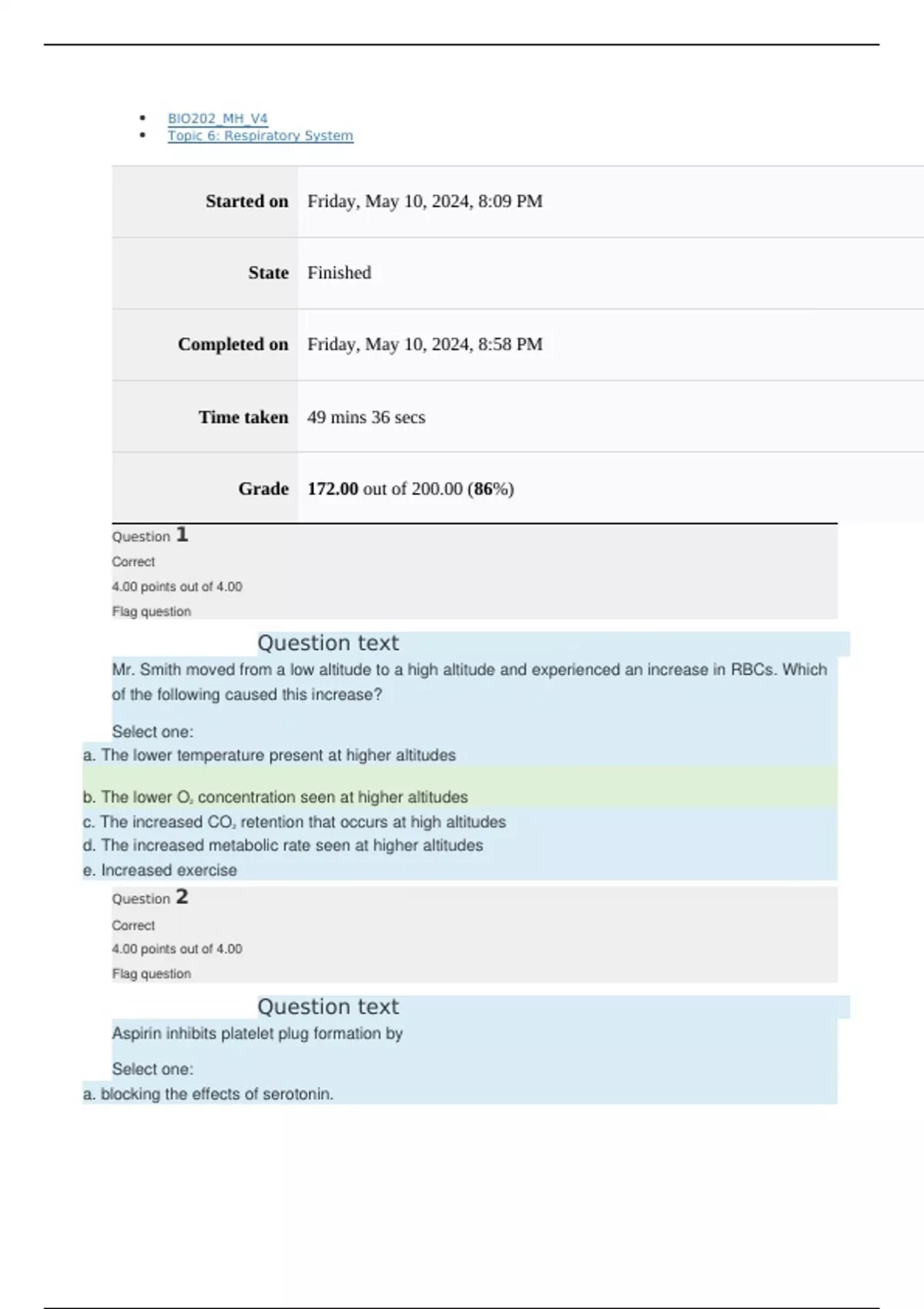 Mr. Smith moved from a low altitude to a high altitude and experienced an increase in RBCs. Which of the following caused this increase? Select one: a. The lower temperature present at higher altitudes b. The lower O2 concentration seen at higher altitudes c. The increased CO2 retention that occurs at high altitudes d. The increased metabolic rate seen at higher altitudes e. Increased exercise Question 2 Correct 4.00 points out of 4.00 Flag question Question text Aspirin inhibits platelet plug formation by Select one: a. blocking the effects of serotonin. b. interfering with the synthesis of prostaglandins. c. making the platelet surface less sticky. d. blocking the binding of platelets to collagen. e. stimulating the release of heparin. Question 3 Correct 4.00 points out of 4.00 Flag question Question text Each hemoglobin molecule Select one: a. has one heme group. b. transports four oxygen molecules. c. contains two polypeptide chains. d. has two iron atoms and two globin chains. e. transports one oxygen molecule. Question 4 Incorrect 0.00 points out of 4.00 Flag question Question text Which of the following is NOT true of plasma? Select one: a. Plasma is about 91% water. b. The color of plasma is yellow. c. Plasma volume can change drastically. d. Plasma is a colloid. Question 5 Correct 4.00 points out of 4.00 Flag question Question text When a person develops a sore throat, white blood cells are drawn to the area of infection by a process called_________. Select one:
