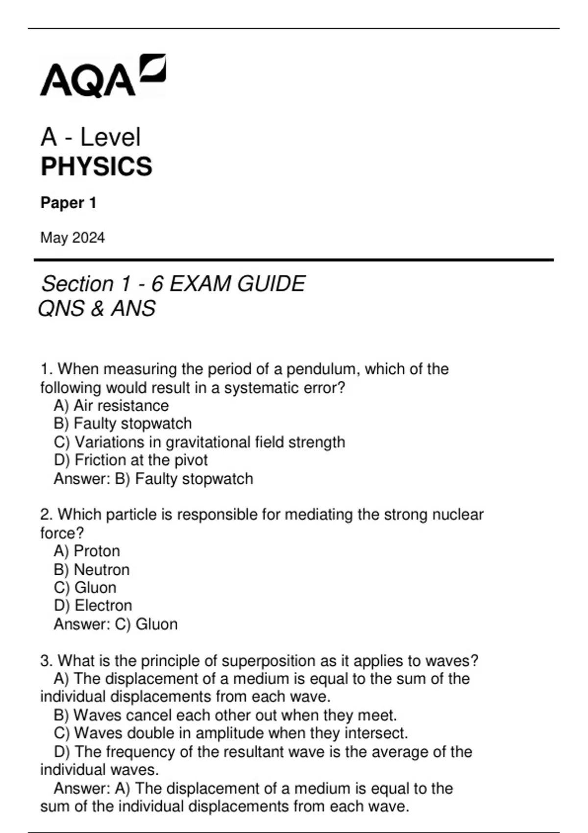 AQA A - LEVEL PHYSICS PAPER 1 SECTION 1 - 6 EXAM GUIDE QNS & ANS MAY 2024.AQA A - LEVEL PHYSICS PAPER 1 SECTION 1 - 6 EXAM GUIDE QNS & ANS MAY 2024.AQA A - LEVEL PHYSICS PAPER 1 SECTION 1 - 6 EXAM GUIDE QNS & ANS MAY 2024.