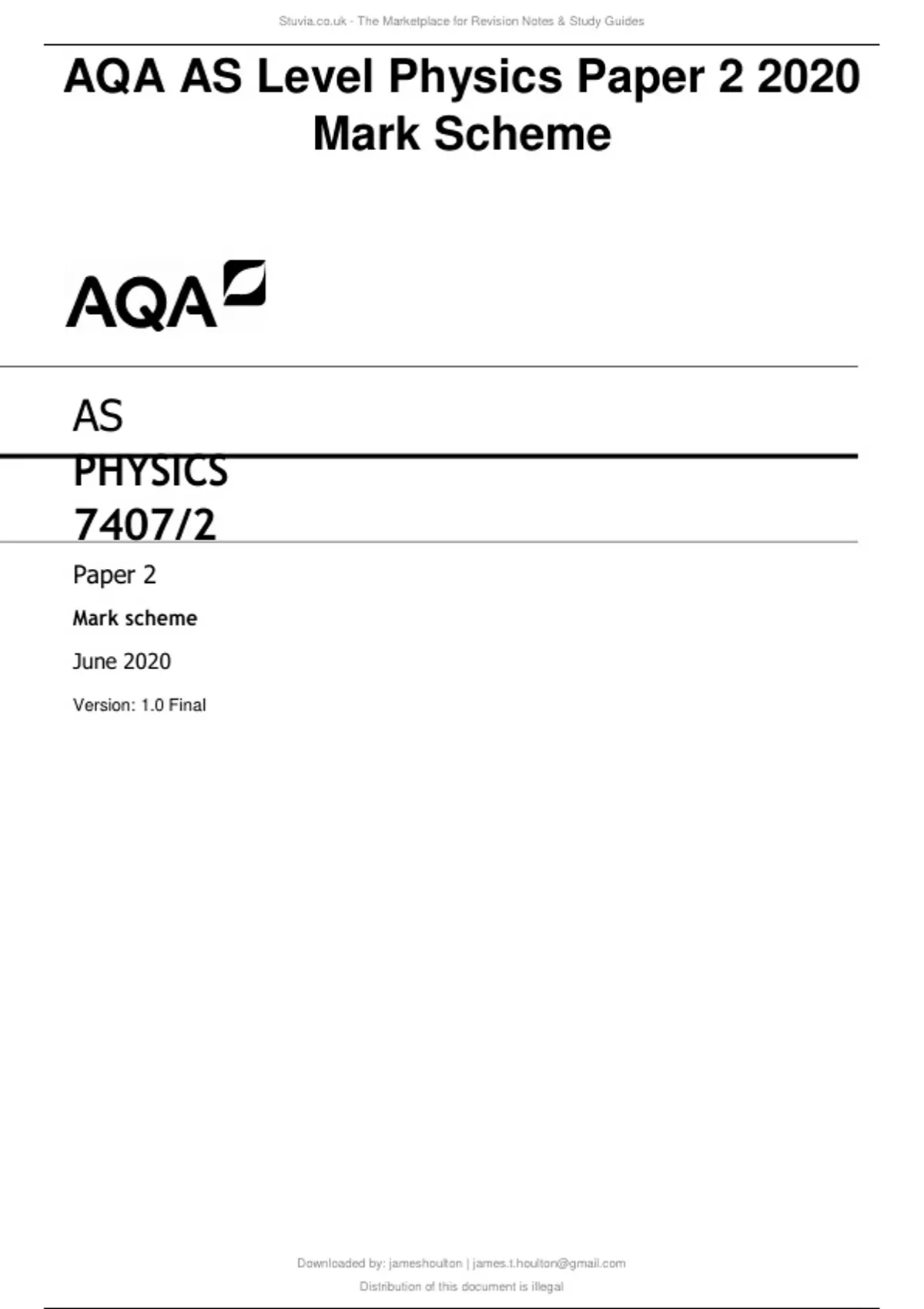AQA AS Level Physics Paper 2 2020 Mark Scheme.
