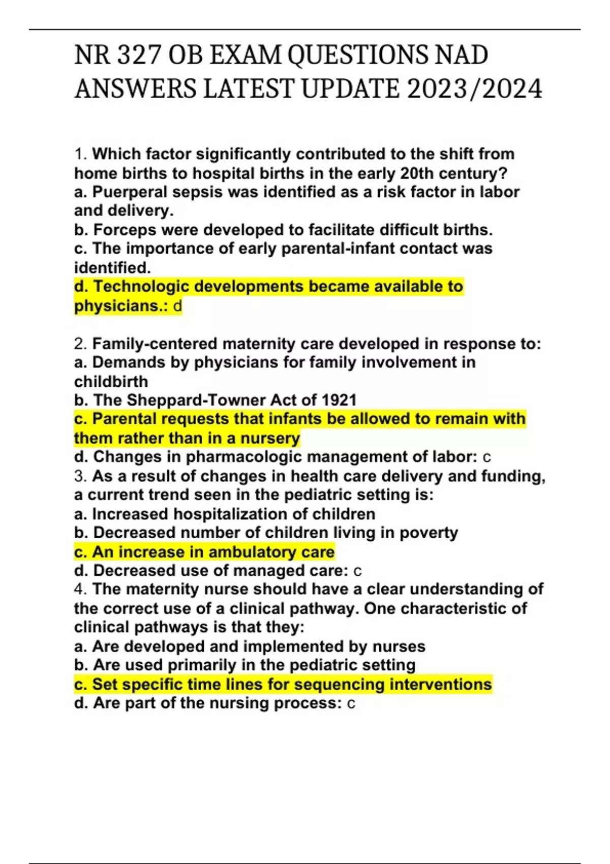 Which factor significantly contributed to the shift from home births to hospital births in the early 20th century? a. Puerperal sepsis was identified as a risk factor in labor and delivery. b. Forceps were developed to facilitate difficult births. c. The importance of early parental-infant contact was identified. d. Technologic developments became available to physicians.: d 2. Family-centered maternity care developed in response to: a. Demands by physicians for family involvement in childbirth b. The Sheppard-Towner Act of 1921 c. Parental requests that infants be allowed to remain with them rather than in a nursery d. Changes in pharmacologic management of labor: c 3. As a result of changes in health care delivery and funding, a current trend seen in the pediatric setting is: a. Increased hospitalization of children b. Decreased number of children living in poverty c. An increase in ambulatory care d. Decreased use of managed care: c 4. The maternity nurse should have a clear understanding of the correct use of a clinical pathway. One characteristic of clinical pathways is that they: a. Are developed and implemented by nurses b. Are used primarily in the pediatric setting c. Set specific time lines for sequencing interventions d. Are part of the nursing process: c 5. The intrapartum woman sees no need for an admission fetal monitoring strip. If she continues to refuse, what is the first action the nurse should take? a. Consult the family of the woman. b. Notify the physician. c. Document the woman's refusal in the nurse's notes. d. Make a referral to the hospital ethics committee.: b 6. Which patient situation fails to meet the first requirement of informed consent? a. The patient does not understand the physician's explanations. b. The physician gives the patient only a partial list of possible side effects and complications. c. The patient is confused and disoriented. d. The patient signs a consent form because her husband tells her to.: c 7. The mother of a 5-year-old female inpatient on the pediatric unit asks the nurse if she could provide information regarding the recommended amount of television viewing time for her daughter. The nurse responds that the appropriate amount of time a child should be watching television is: a. 1-2 hours per day b. 2-3 hours per day c. 3-4 hours per day d. 4 hours or more: a 8. Many communities now offer the availability of free-standing birth centers to provide care for low-risk women during pregnancy, birth, and postpartum. When counseling the newly pregnant woman regarding this option, the nurse should be aware that this type of care setting includes which advantages? Select all that apply. a. Less expensive than acute-care hospitals b. Access to follow-up care for 6 weeks postpartum c. Equipped for obstetric emergencies d. Safe, home-like births in a familiar setting e. Staffing by lay midwives: a,b,d