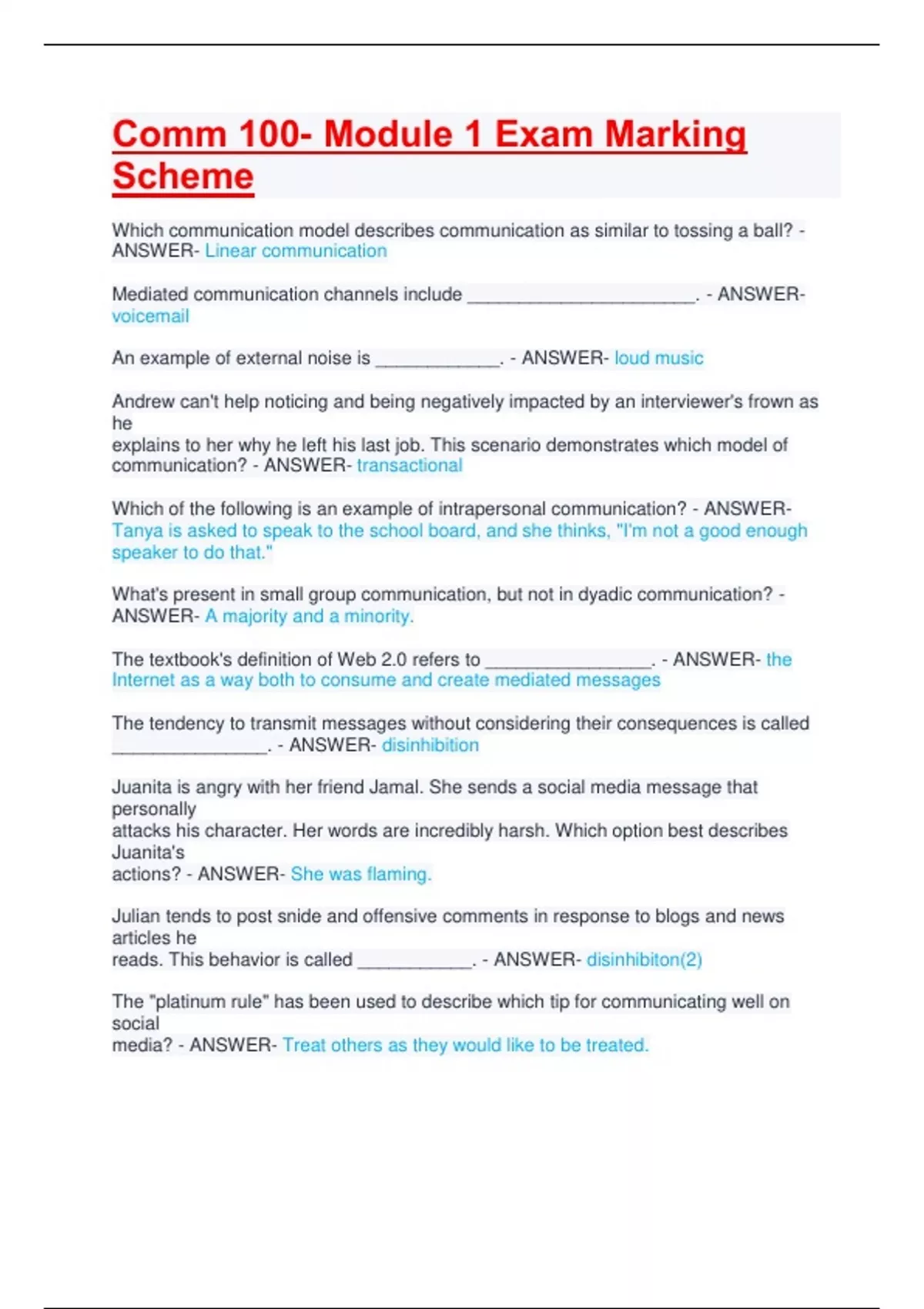 Comm 100- Module 1 Exam Marking Scheme Which communication model describes communication as similar to tossing a ball? - ANSWER- Linear communication Mediated communication channels include ______________________. - ANSWERvoicemail An example of external noise is ____________. - ANSWER- loud music Andrew can't help noticing and being negatively impacted by an interviewer's frown as he explains to her why he left his last job. This scenario demonstrates which model of communication? - ANSWER- transactional Which of the following is an example of intrapersonal communication? - ANSWERTanya is asked to speak to the school board, and she thinks, "I'm not a good enough speaker to do that." What's present in small group communication, but not in dyadic communication? - ANSWER- A majority and a minority. The textbook's definition of Web 2.0 refers to ________________. - ANSWER- the Internet as a way both to consume and create mediated messages The tendency to transmit messages without considering their consequences is called _______________. - ANSWER- disinhibition Juanita is angry with her friend Jamal. She sends a social media message that personally attacks his character. Her words are incredibly harsh. Which option best describes Juanita's actions? - ANSWER- She was flaming. Julian tends to post snide and offensive comments in response to blogs and news articles he reads. This behavior is called ___________. - ANSWER- disinhibiton(2) The "platinum rule" has been used to describe which tip for communicating well on social media? - ANSWER- Treat others as they would like to be treated. The ability to construct a variety of frameworks for viewing an issue is called ___________. - ANSWER- cognitive complexity The process of paying close attention to one's own behavior and using these observations to shape the way one behaves is called __________________. - ANSWER- selfmonitoring According to the textbook, the ability to achieve goals while maintaining or enhancing a relationship in which it occurs involves __________________. - ANSWERcommunication competence