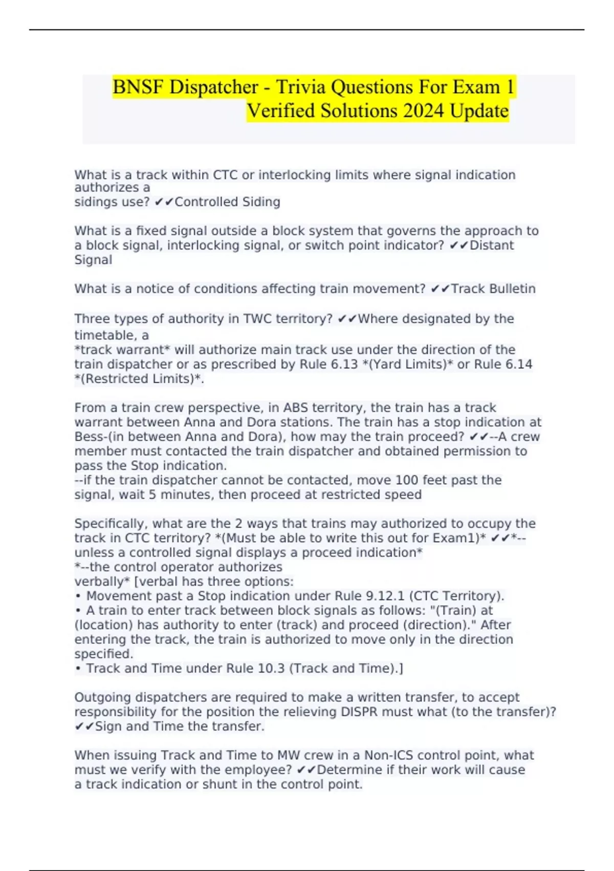 BNSF Dispatcher - Trivia Questions For Exam 1 Verified Solutions 2024 Update
