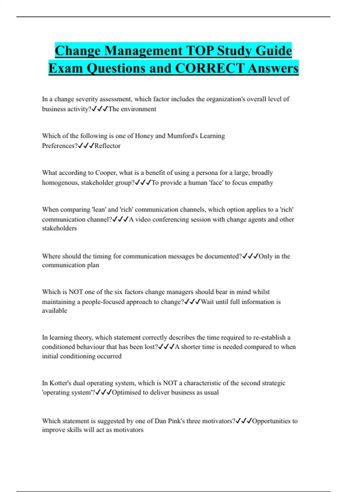 Change Management TOP Study Guide Exam Questions and CORRECT Answers