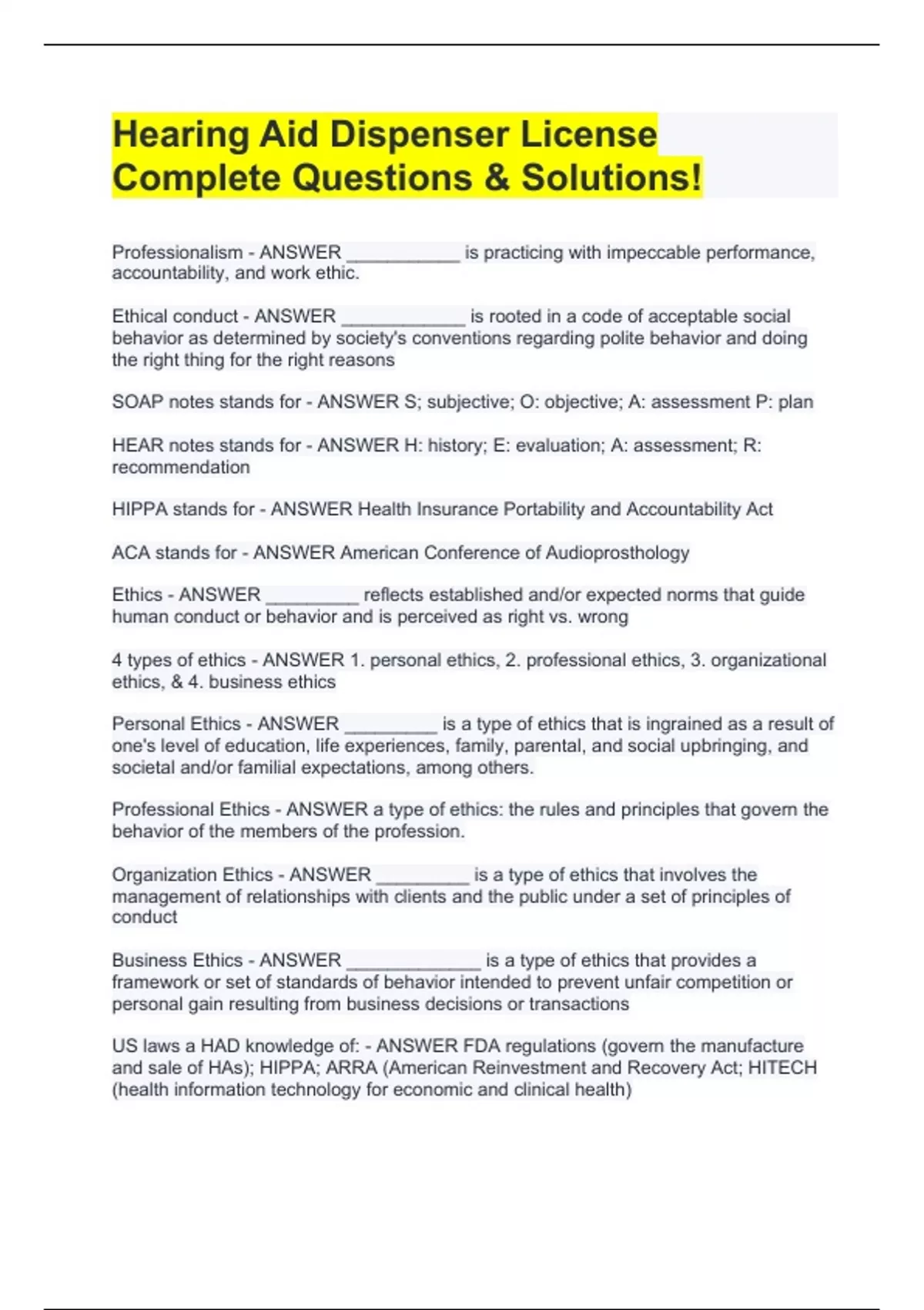 Professionalism - ANSWER ___________ is practicing with impeccable performance, accountability, and work ethic. Ethical conduct - ANSWER ____________ is rooted in a code of acceptable social behavior as determined by society's conventions regarding polite behavior and doing the right thing for the right reasons SOAP notes stands for - ANSWER S; subjective; O: objective; A: assessment P: plan HEAR notes stands for - ANSWER H: history; E: evaluation; A: assessment; R: recommendation HIPPA stands for - ANSWER Health Insurance Portability and Accountability Act ACA stands for - ANSWER American Conference of Audioprosthology Ethics - ANSWER _________ reflects established and/or expected norms that guide human conduct or behavior and is perceived as right vs. wrong 4 types of ethics - ANSWER 1. personal ethics, 2. professional ethics, 3. organizational ethics, & 4. business ethics Personal Ethics - ANSWER _________ is a type of ethics that is ingrained as a result of one's level of education, life experiences, family, parental, and social upbringing, and societal and/or familial expectations, among others. Professional Ethics - ANSWER a type of ethics: the rules and principles that govern the behavior of the members of the profession. Organization Ethics - ANSWER _________ is a type of ethics that involves the management of relationships with clients and the public under a set of principles of conduct Business Ethics - ANSWER _____________ is a type of ethics that provides a framework or set of standards of behavior intended to prevent unfair competition or personal gain resulting from business decisions or transactions US laws a HAD knowledge of: - ANSWER FDA regulations (govern the manufacture and sale of HAs); HIPPA; ARRA (American Reinvestment and Recovery Act; HITECH (health information technology for economic and clinical health)