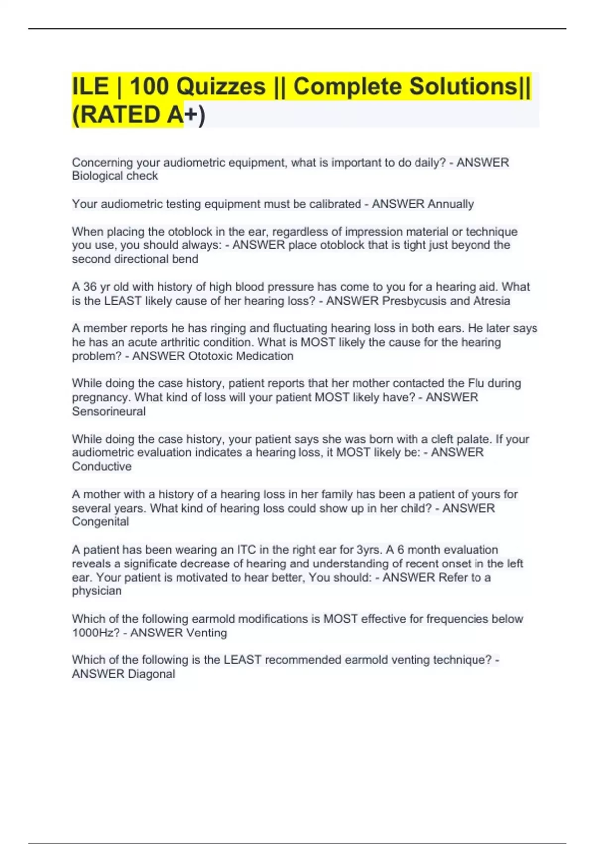 Concerning your audiometric equipment, what is important to do daily? - ANSWER Biological check Your audiometric testing equipment must be calibrated - ANSWER Annually When placing the otoblock in the ear, regardless of impression material or technique you use, you should always: - ANSWER place otoblock that is tight just beyond the second directional bend A 36 yr old with history of high blood pressure has come to you for a hearing aid. What is the LEAST likely cause of her hearing loss? - ANSWER Presbycusis and Atresia A member reports he has ringing and fluctuating hearing loss in both ears. He later says he has an acute arthritic condition. What is MOST likely the cause for the hearing problem? - ANSWER Ototoxic Medication While doing the case history, patient reports that her mother contacted the Flu during pregnancy. What kind of loss will your patient MOST likely have? - ANSWER Sensorineural While doing the case history, your patient says she was born with a cleft palate. If your audiometric evaluation indicates a hearing loss, it MOST likely be: - ANSWER Conductive A mother with a history of a hearing loss in her family has been a patient of yours for several years. What kind of hearing loss could show up in her child? - ANSWER Congenital A patient has been wearing an ITC in the right ear for 3yrs. A 6 month evaluation reveals a significate decrease of hearing and understanding of recent onset in the left ear. Your patient is motivated to hear better, You should: - ANSWER Refer to a physician Which of the following earmold modifications is MOST effective for frequencies below 1000Hz? - ANSWER Venting Which of the following is the LEAST recommended earmold venting technique? - ANSWER Diagonal