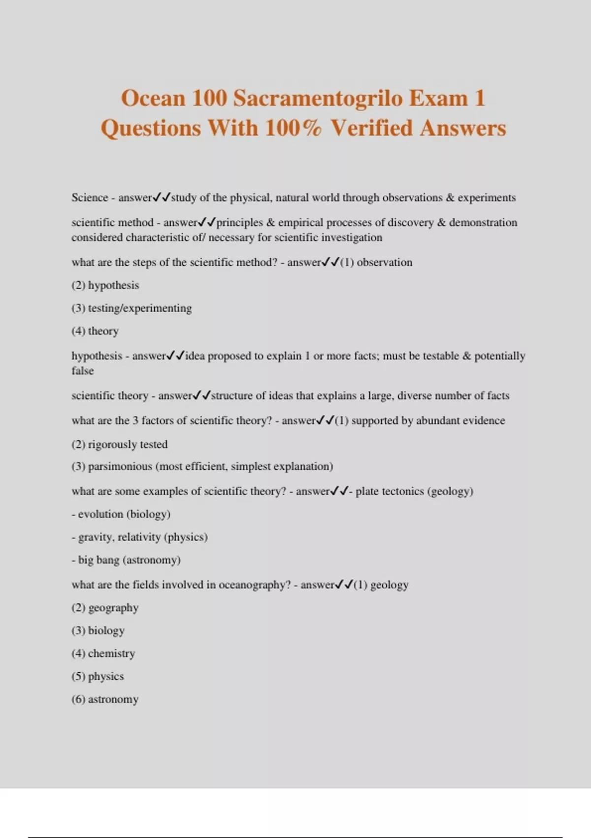 Ocean 100 Sacramentogrilo Exam 1 Questions With 100% Verified Answers Science - answerstudy of the physical, natural world through observations & experiments scientific method - answerprinciples & empirical processes of discovery & demonstration considered characteristic of/ necessary for scientific investigation what are the steps of the scientific method? - answer(1) observation (2) hypothesis (3) testing/experimenting (4) theory hypothesis - answeridea proposed to explain 1 or more facts; must be testable & potentially false scientific theory - answerstructure of ideas that explains a large, diverse number of facts what are the 3 factors of scientific theory? - answer(1) supported by abundant evidence (2) rigorously tested (3) parsimonious (most efficient, simplest explanation) what are some examples of scientific theory? - answer- plate tectonics (geology) - evolution (biology) - gravity, relativity (physics) - big bang (astronomy) what are the fields involved in oceanography? - answer(1) geology (2) geography (3) biology (4) chemistry (5) physics (6) astronomy (7) engineering what are some examples involving geology? - answerseafloor tectonics, coastal processes, sediments, hydrologic cycle what are some examples involving geography? - answerwind belts, weather, coastal landforms, world climate what are some examples involving biology? - answerfisheries, ecological surveys, microbiology, marine adaptions what are some examples involving chemistry? - answerdissolved components, temperature dependence, stratification/density, chemical tracers what are some examples involving physics? - answercurrents, waves, sonar, thermal properties of water what are some examples involving astronomy? - answertidal forces, oceans on other planets, origin of water, origin of life what are some examples involving engineering? - answermachinery used by scientists to explore the deep-ocean floor what are the earth's 4 spheres? - answer(1) lithosphere (2) asthenosphere (3) mesosphere (4) outer & inner core cross-sectional view - answerside view (ex. cutting a cake, able to see its layers) map view - answerbird's eye view, block diagram - answer3-d view mercator projection - answer2-d depiction of spherical earth; lands towards poles are magnified/distorted what are the 5 oceans? - answer(1) pacific (2) atlantic (3) indian (4) arctic (5) antarctic