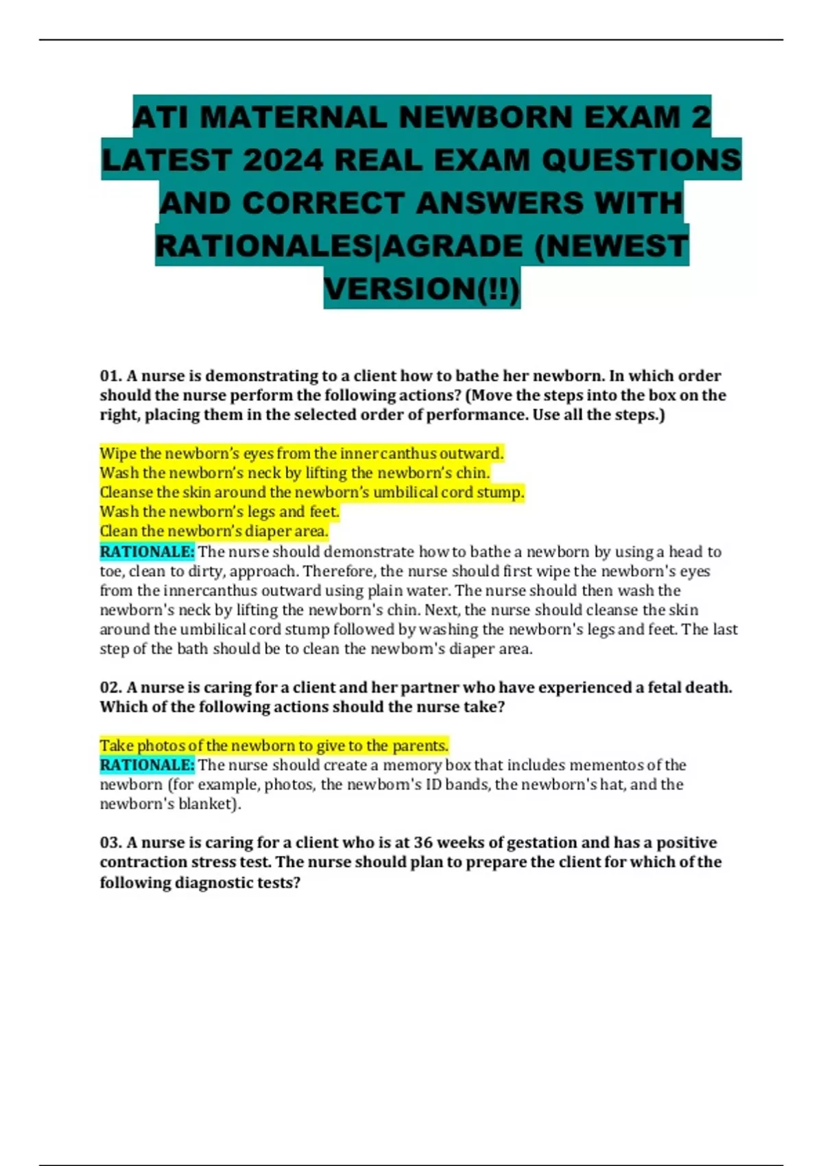 ATI MATERNAL NEWBORN EXAM 2 LATEST 2024 REAL EXAM QUESTIONS AND CORRECT ANSWERS WITH RATIONALES|AGRADE (NEWEST VERSION(!!)