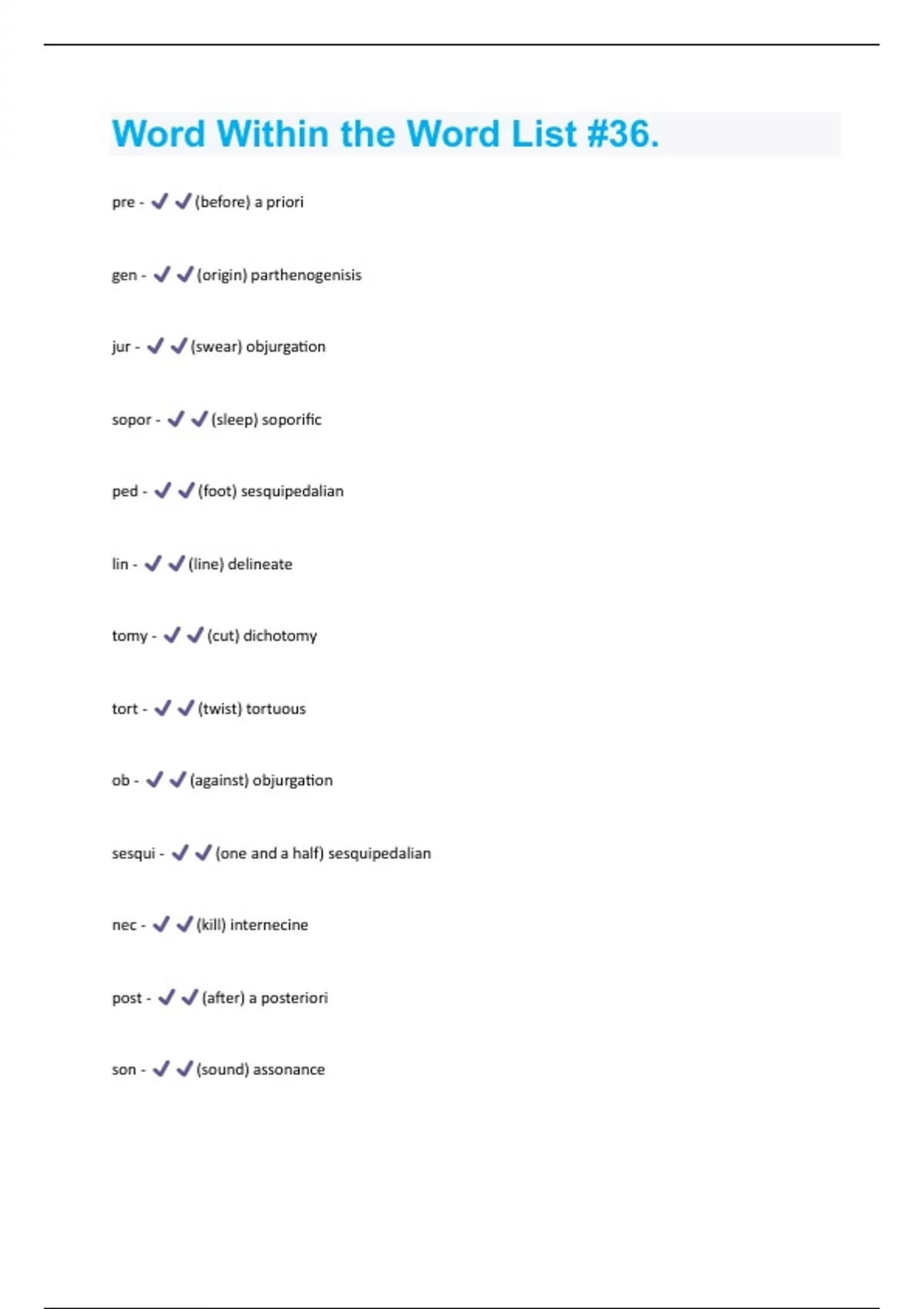 pre - (before) a priori gen - (origin) parthenogenisis jur - (swear) objurgation sopor - (sleep) soporific ped - (foot) sesquipedalian lin - (line) delineate tomy - (cut) dichotomy tort - (twist) tortuous ob - (against) objurgation sesqui - (one and a half) sesquipedalian nec - (kill) internecine post - (after) a posteriori son - (sound) assonancedemo - (people) demonic inter - (between) internecine cracy - (government) plutocracy phan - (appearance) epiphany dicho - (in two parts) dichotomy sui - (self) sui generis partheno - (virgin) parthenogenisis pluto - (weatlh) plutocracy a priori - (from theory) The theory was developed through deduction from principle, a priori. a posteriori - (from observation) The idea was reached inductively from evidence, a posteriori parthenogenesis - (unfertilized birth) Athena was born by parthenogenesis from Zeus's forehead. assonance - (vowel repetition) Notice the assonance of the words croon, duel, and tube. objurgation - (rebuke) We read the teacher's red penned objurgations on the term paper. demotic - (of the common people) We studied the demotic alleyway ific - (sleep-inducing) His soporific platitudes bored everyone in the audience. i nternecine - (mutually destructive) Their internecine wars doomed the barbarian tribes. sesquipedalian - (very long words) Having a sesquipedalian vocabulary is fun. sui generis - (unique) Her self-originated style was bodly sui generis. plutocracy - (government of wealthy) The democracy degenerated into a plutocracy. delineate - (to outline) Please quickly delineate the features of your plan. dichotomy - (two part division) Is there a clear dichotomy between the two choices? epiphany - (revelation) In a sudden epiphany, he saw the solution! tortuous - (twisting) The tortuous highway winds through the hills of West Virginia.