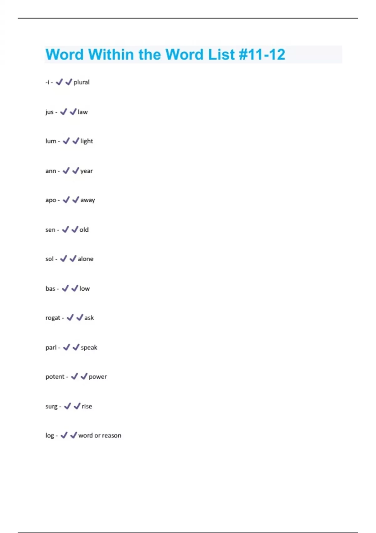 -i - plural jus - law lum - light ann - year apo - away sen - old sol - alone bas - low rogat - ask parl - speak potent - power surg - rise log - word or reasongram - writing cant - sing reg - rule pro - forward gyn - woman ag - to do act - to do mob - move sess - sit fic - make nounce - tell andro - man an- - without ab - awaymel - song aden - gland aer - air alb - white ase - enzyme