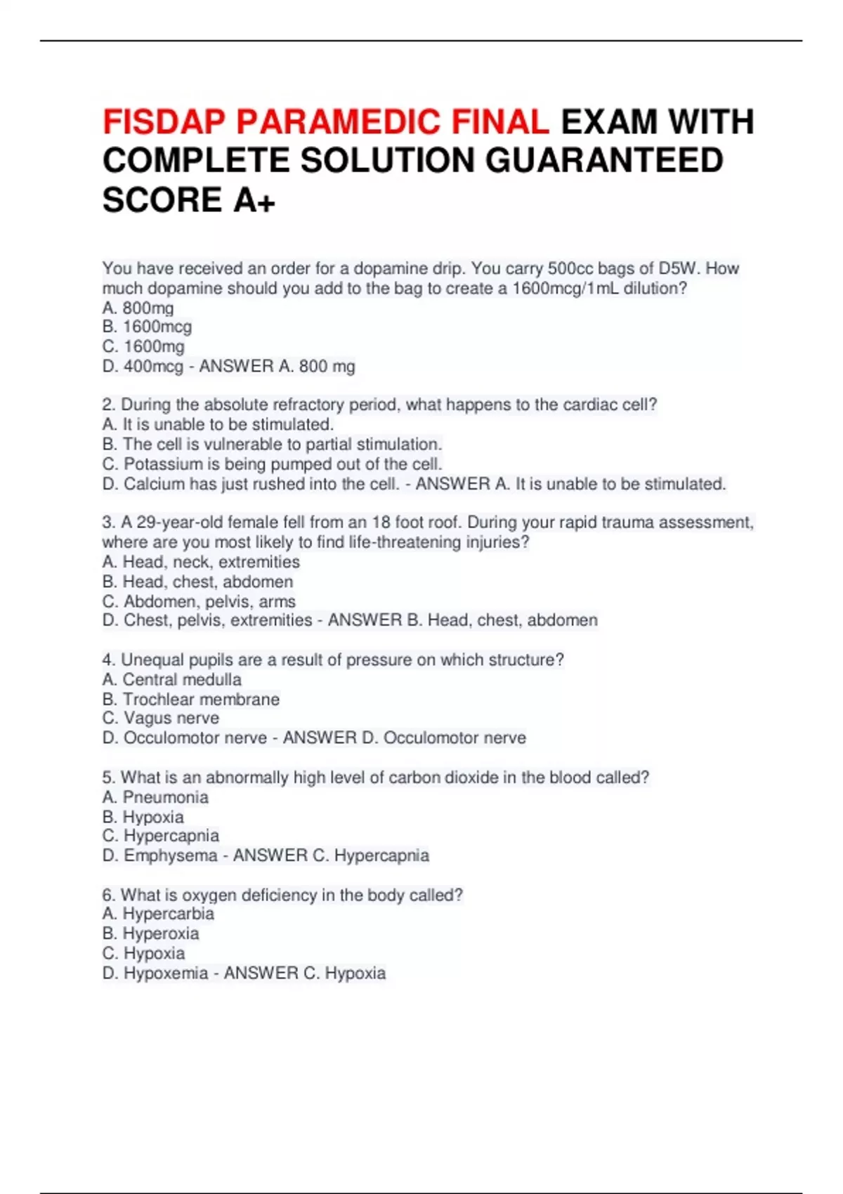 FISDAP PARAMEDIC FINAL EXAM WITH COMPLETE SOLUTION GUARANTEED SCORE A+