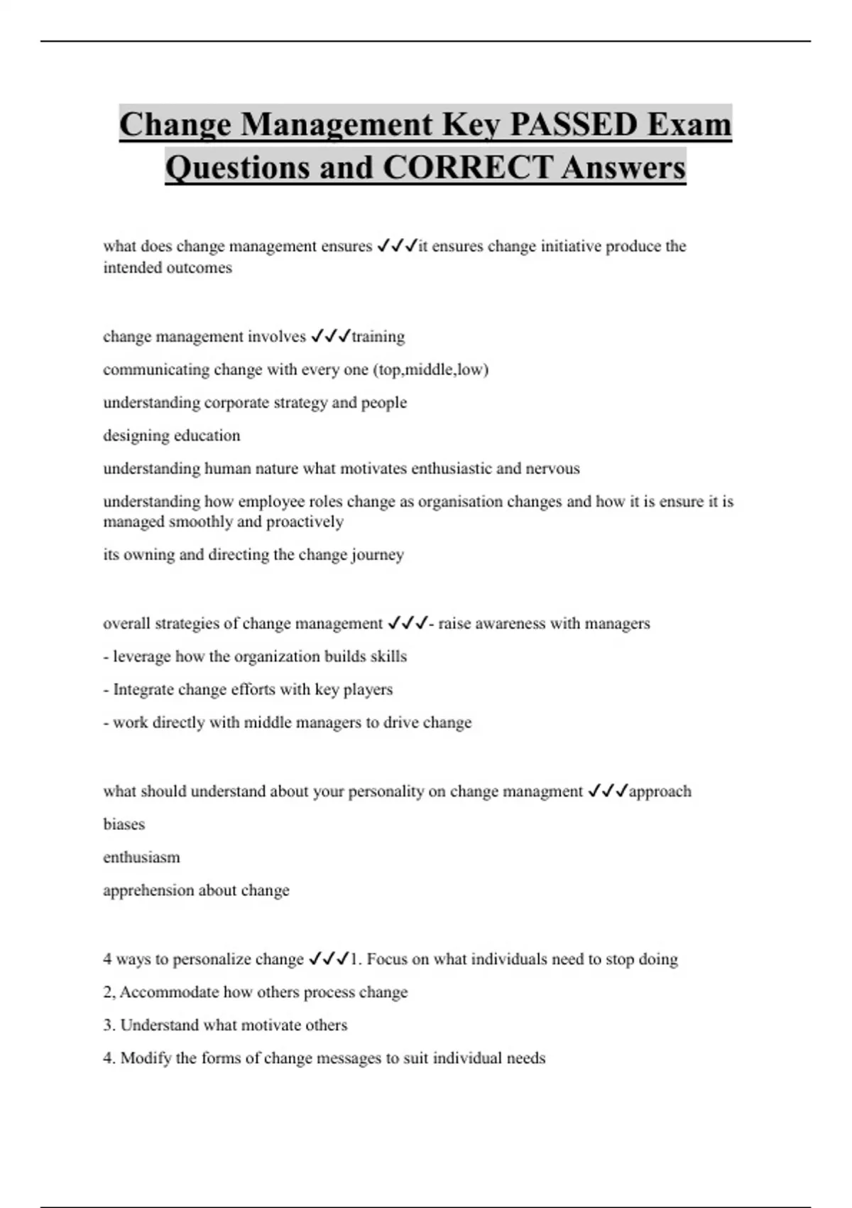 Change Management Key PASSED Exam Questions and CORRECT Answers