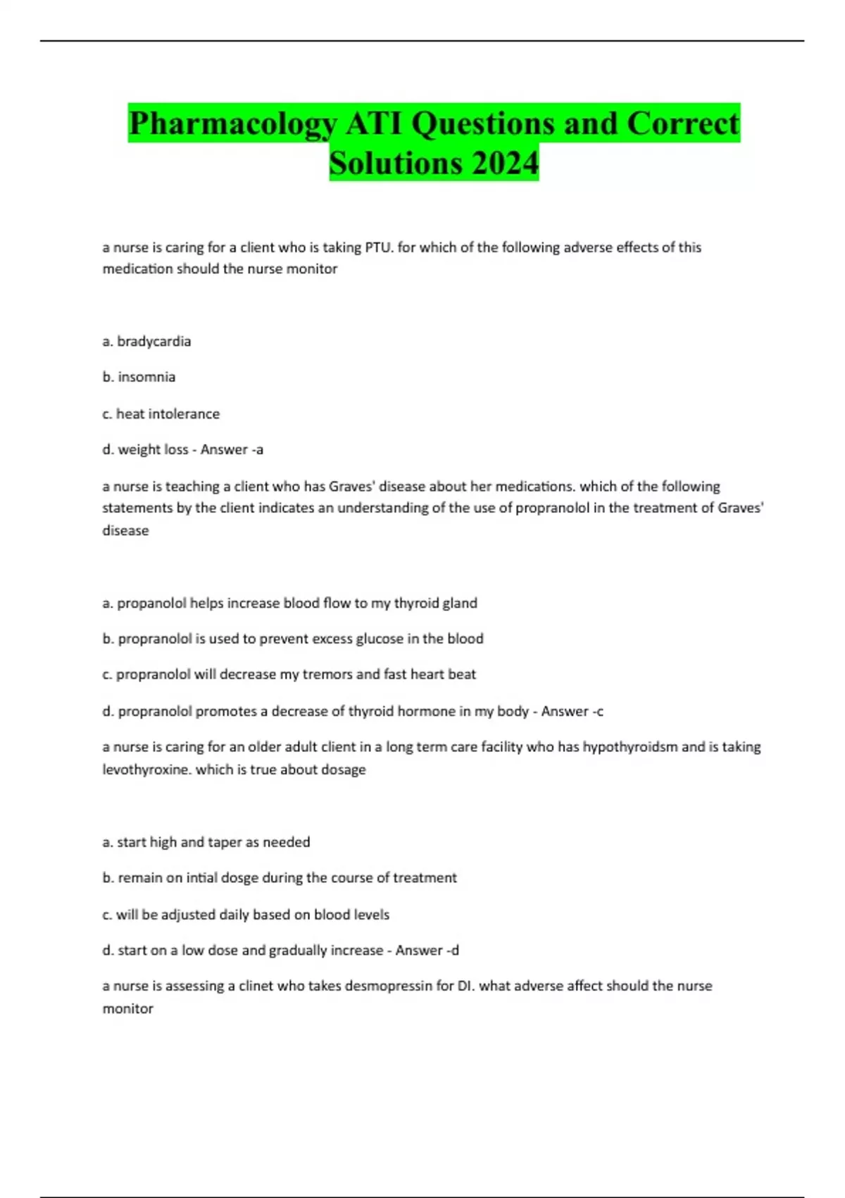 Pharmacology ATI Questions and Correct Solutions 2024 a nurse is caring for a client who is taking PTU. for which of the following adverse effects of this medication should the nurse monitor a. bradycardia b. insomnia c. heat intolerance d. weight loss - Answer -a a nurse is teaching a client who has Graves' disease about her medications. which of the following statements by the client indicates an understanding of the use of propranolol in the treatment of Graves' disease a. propanolol helps increase blood flow to my thyroid gland b. propranolol is used to prevent excess glucose in the blood c. propranolol will decrease my tremors and fast heart beat d. propranolol promotes a decrease of thyroid hormone in my body - Answer -c a nurse is caring for an older adult client in a long term care facility who has hypothyroidsm and is taking levothyroxine. which is true about dosage a. start high and taper as needed b. remain on intial dosge during the course of treatment c. will be adjusted daily based on blood levels d. start on a low dose and gradually increase - Answer -d a nurse is assessing a clinet who takes desmopressin for DI. what adverse affect should the nurse monitora. hypovolemia b. hypercalemia c. agitation d. headache - Answer -d which of the following dactors should the educator include as a reason to decrease the medication dosages? (SATA) a. increased renal excretion b. increased medication-metabolizing enzym