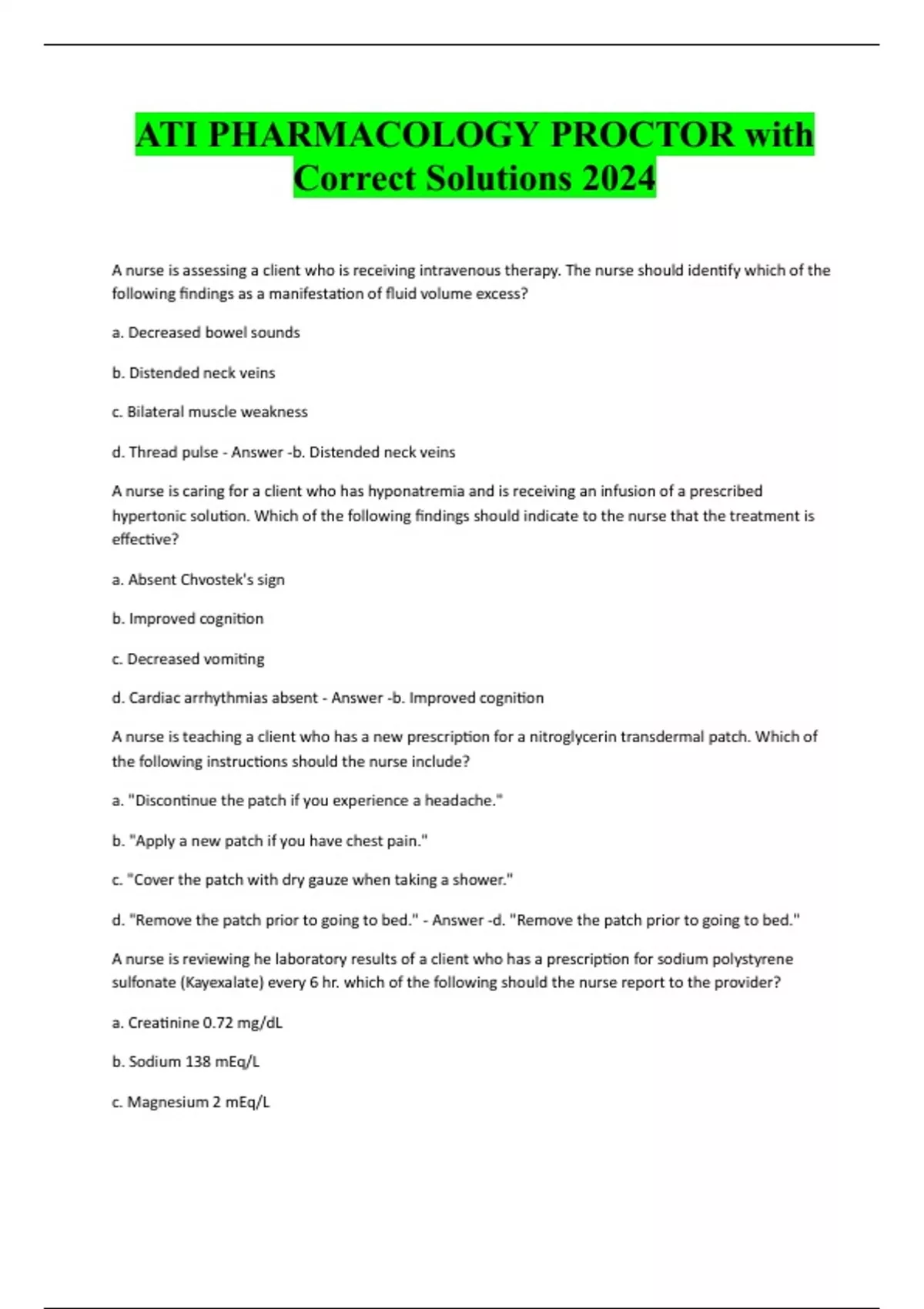 ATI PHARMACOLOGY PROCTOR with Correct Solutions 2024 A nurse is assessing a client who is receiving intravenous therapy. The nurse should identify which of the following findings as a manifestation of fluid volume excess? a. Decreased bowel sounds b. Distended neck veins c. Bilateral muscle weakness d. Thread pulse - Answer -b. Distended neck veins A nurse is caring for a client who has hyponatremia and is receiving an infusion of a prescribed hypertonic solution. Which of the following findings should indicate to the nurse that the treatment is effective? a. Absent Chvostek's sign b. Improved cognition c. Decreased vomiting d. Cardiac arrhythmias absent - Answer -b. Improved cognition A nurse is teaching a client who has a new prescription for a nitroglycerin transdermal patch. Which of the following instructions should the nurse include? a. "Discontinue the patch if you experience a headache." b. "Apply a new patch if you have chest pain." c. "Cover the patch with dry gauze when taking a shower." d. "Remove the patch prior to going to bed." - Answer -d. "Remove the patch prior to going to bed." A nurse is reviewing he laboratory results of a client who has a prescription for sodium polystyrene sulfonate (Kayexalate) every 6 hr. which of the following should the nurse report to the provider? a. Creatinine 0.72 mg/dL b. Sodium 138 mEq/L c. Magnesium 2 mEq/Ld. Potassium 5.2 mEq/L - Answer -d. Potassium 5.2 mEq/L - Hyperkalemia (serum potassium level greater than 5.0 mEq/L) increases the client risk for fatal cardiac dysrhythmias. Kayexalate is used to decrease the serum potassium level so the PN should monitor the client's serum potassium level A nurse is caring for a client who has tuberculosis and is taking isoniazid and rifampin. Which of the following outcomes indicates that the client is adhering to the medication regimen? a. The client has a negative sputum culture b. The client tests negative for HIV